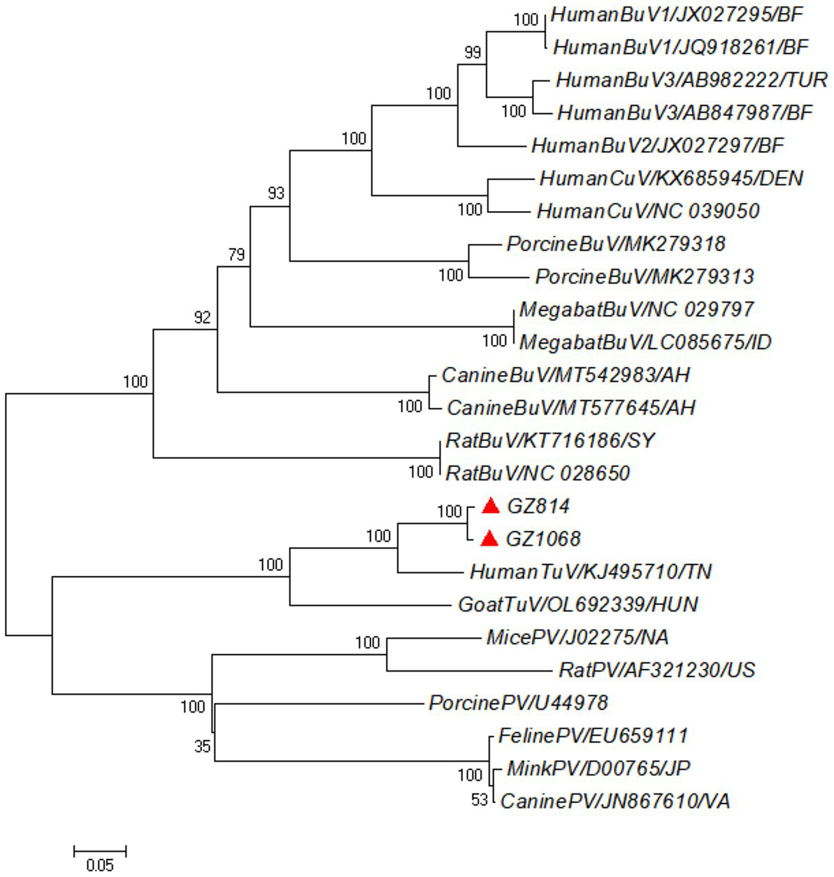 Figure 1. Phylogenetic tree based on the near-complete genome sequences of HumanTuV and other novel parvoviruses. The neighbor-joining method with the Nei-Gojobori (Jukes-Cantor) substitution model was used for the construction, with 1,000 bootstrapping replicated to test the branching. Red triangles indicated the Human TuV sequences identified in this study. TuV, tusavirus; BuV, bufavirus; CuV, cutavirus; PV, parvovirus.