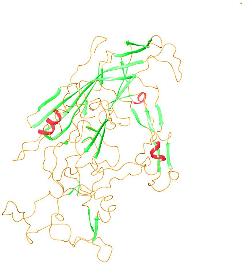 Figure 2. Tertiary structure prediction of VP2 protein of GZ1068. The red wavy lines represented the α-helices; the green sheets indicated β-strands; the orange curves represented random coils. VP, viral protein.