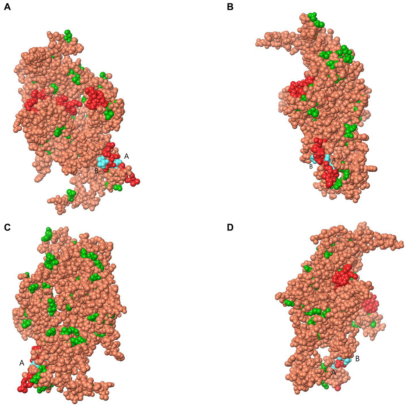 Figure 3. Map of B-cell epitopes prediction and selection pressure site of VP2-TuV gene (A–D). The predicted B-cell epitopes in the VP2 protein was indicated in red. The selective pressure sites were indicated in green. Codons 415 and 416 (A), 418, and 419 (B) were located on the predicted B-cell epitopes, indicated in blue. TuV, tusavirus; VP, viral protein.