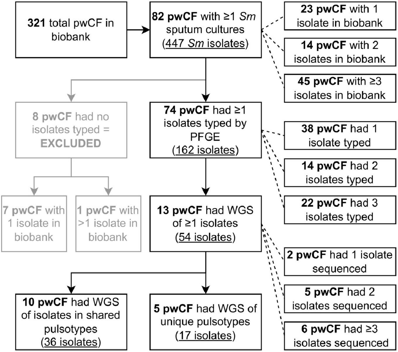Flowchart detailing the number of pwCF and isolates identified and used at different stages of the study. Two of the pwCF included in the five reported with unique pulsotypes sequenced also had isolates in shared pulsotypes and so are double counted. Sm, Stenotrophomonas maltophilia.