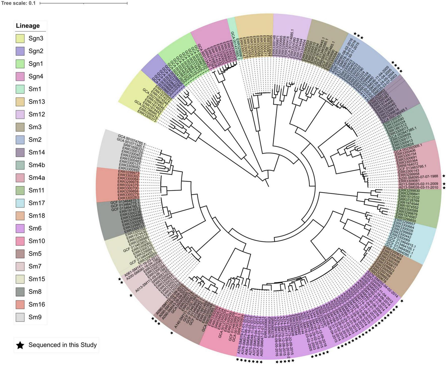 Publicly available S. maltophilia genomes were used to supplement those of our clinic cohort to better understand the placement of our genomes amongst the S. maltophilia species complex (Supplementary Table 1). Ten genomes from each of the 23 S. maltophilia lineages identified by Gröschel et al. (2020) were downloaded and processed.