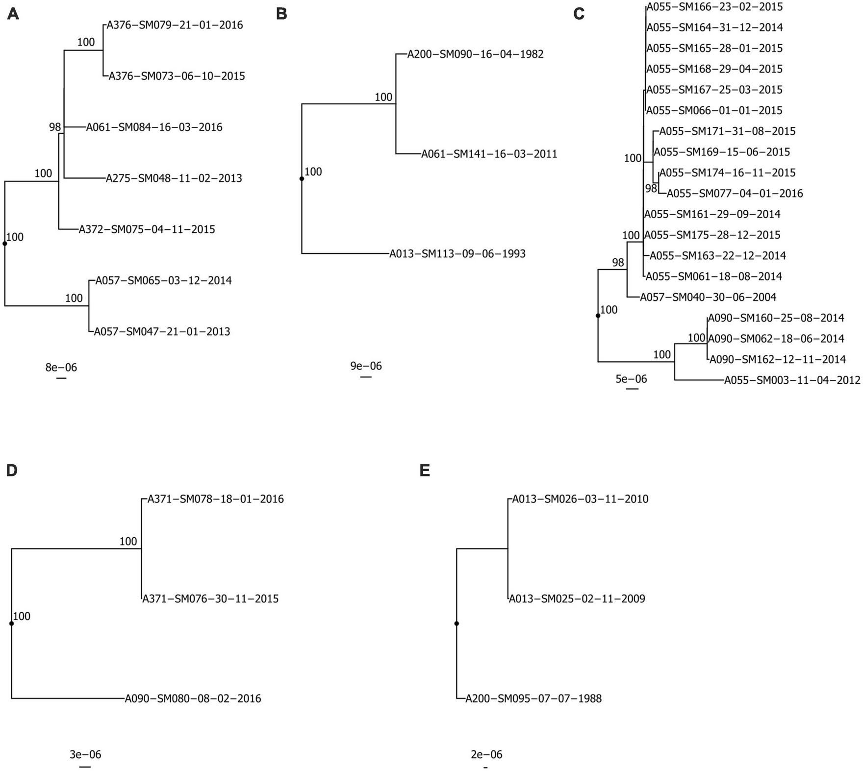 1A single isolate (SM003) belonging to patient A055 belonged to a unique pulsotype (F) but was included due to sharing an ST with pulsotype C isolates. All pulsotype C isolates were more closely related to each other than to the pulsotype F isolate.