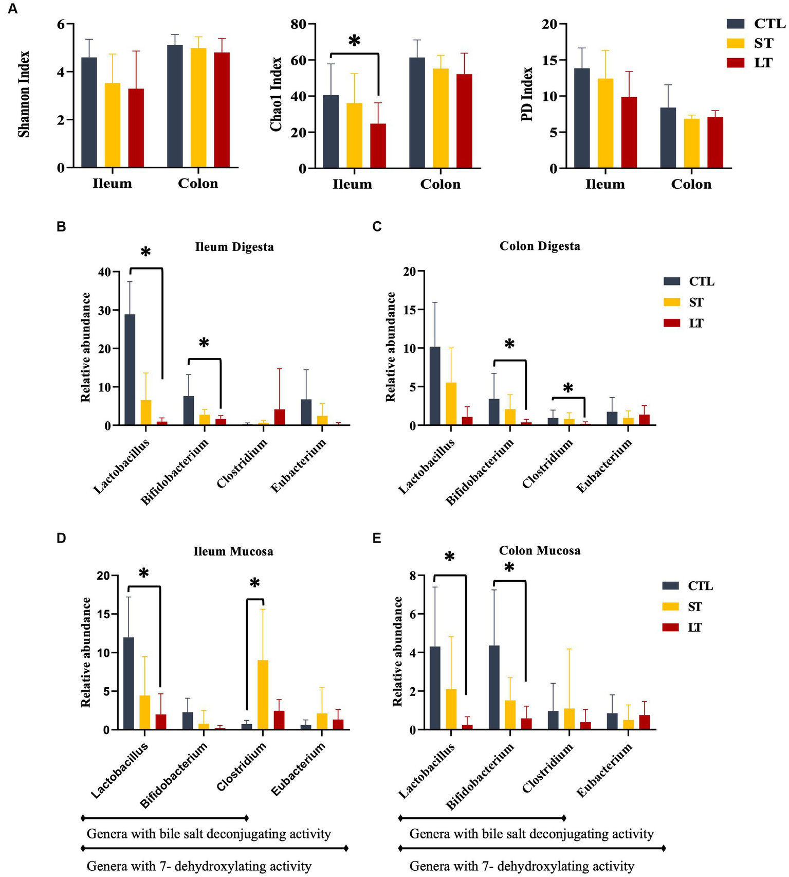 Prophylactic administration of neomycin for either 14 or 28 days resulted in a shift in the composition of the intestinal microbiota in the ileum and colon of calves when compared with control (Supplementary Figure S2). The relative abundance of several bacterial genus groups known to possess genes for bile acid deconjugation and dihydroxylation. The relative abundance of Lactobacillus, and Bifidobacterium in ileum digesta, and Lactobacillus, Bifidobacterium, and Clostridium genus in colon digesta were decreased in LT compared with CTL (p < 0.05; Figure 1B). Additionally, the relative abundance of the Lactobacillus genus in Ileum tissue and Lactobacillus and Bifidobacterium genus in colon tissue were decreased in LT group compared with CTL (p < 0.04; Figure 1B). Lastly, in ileum tissue, the Clostridium genus was increased in ST compared with LT and CTL (p < 0.02; Figure 1B).