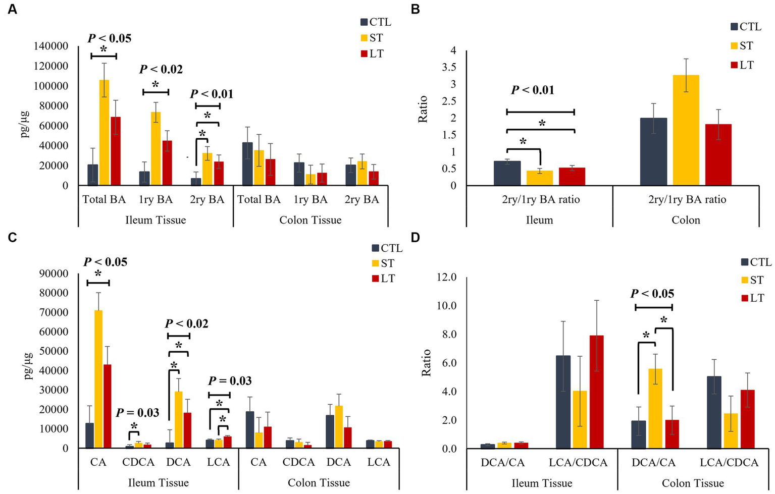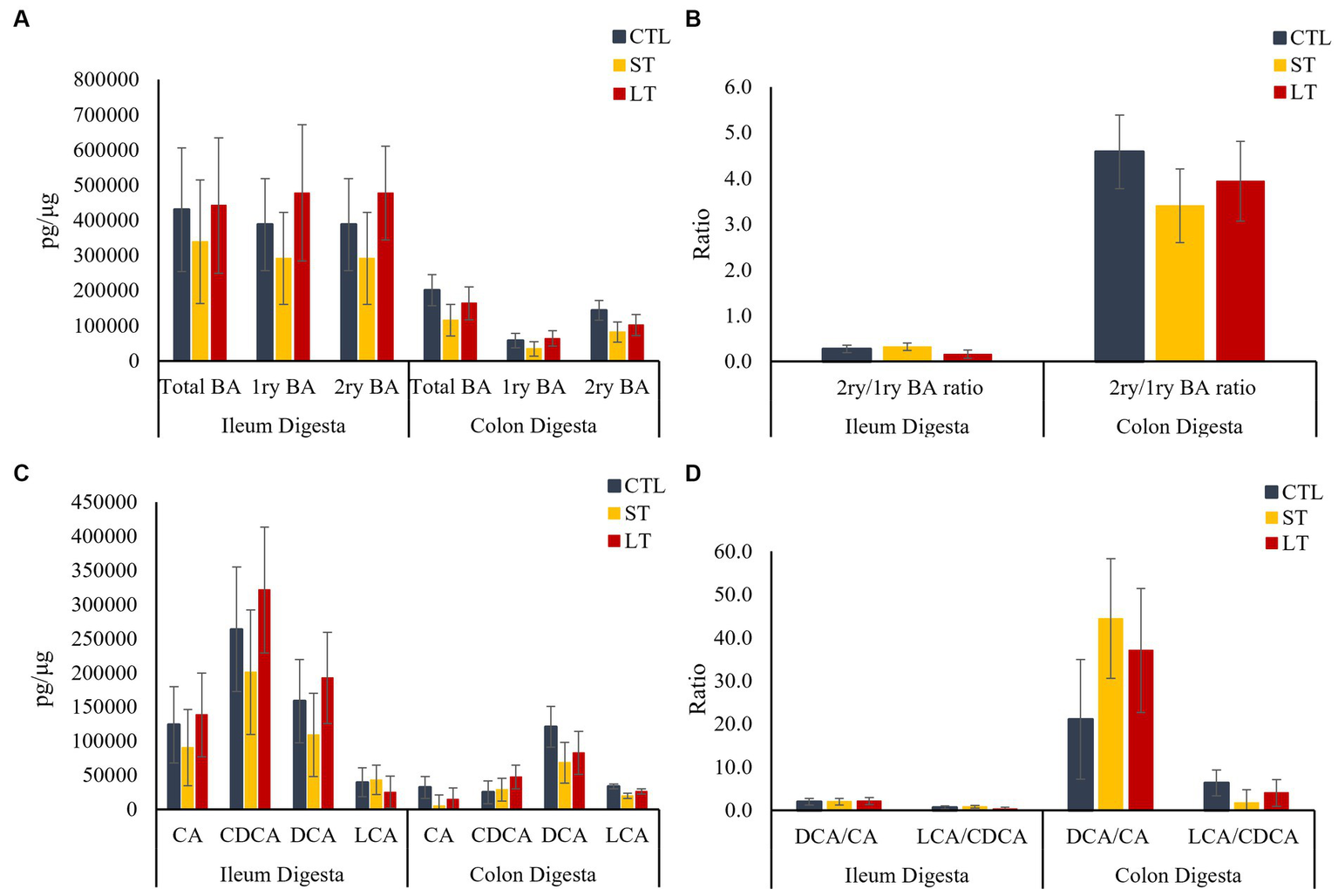 The effect of nonmedicated milk replacer (CTL), or prophylactic neomycin administration at 20 mg/kg per day for 14 days (Short-Term), or for 28 days (Long-Term) on concentrations (pg/μL) of (A) total bile acids (Total BA), primary bile acids (1ry BA), secondary bile acids (2ry BA); and (C) individual primary bile acids cholic acid (CA), chenodeoxycholic acid (CDCA), secondary bile acids deoxycholic acid (DCA) lithocholic acid (LCA) on ileum and colon digesta. In addition, Ratio of secondary to primary bile acids in ileum and colon digesta (B), and ratio of DCA to CA, and LCA to CA (D). Error bars denote SEM.