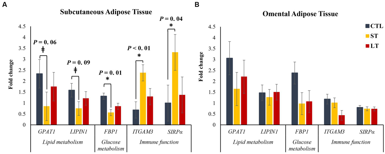 From a transcriptional study of 48 genes involved in lipid metabolism, glucose metabolism, and immune activation, five genes were differentially expressed between treatments, and are presented in Figure 7. There was a tendency in peripheral adipose tissue, but not in omental adipose tissue for the genes glycerol-3-phosphate acyltransferase (GPAT1) and LPIN,1, two genes that encode for triacylglycerol biosynthesis enzymes, to be decreased in ST compared with CTL (p < 0.09; Figure 7A). In addition, the transcript abundance of the gene FBP1, which encodes for the gluconeogenic rate-limiting enzyme fructose-1,6-bisphosphatase, was decreased in ST compared to CTL (p = 0.01; Figure 7A) in peripheral adipose tissue, but not in omental adipose tissue. There was a treatment by tissue interaction for the transcript abundance of the gene PGK1 that encodes for phosphoglycerate kinase 1, a critical enzyme in the process of glycolysis (p = 0.05; Supplementary Table S2), with ST having increased transcript abundance compared with CTL. Lastly, the transcript abundance of the genes ITGAM3 and SIRPα, two genes related to immune activation in macrophages, were increased in ST compared with CTL (p < 0.04; Figure 7A) in peripheral adipose tissue.