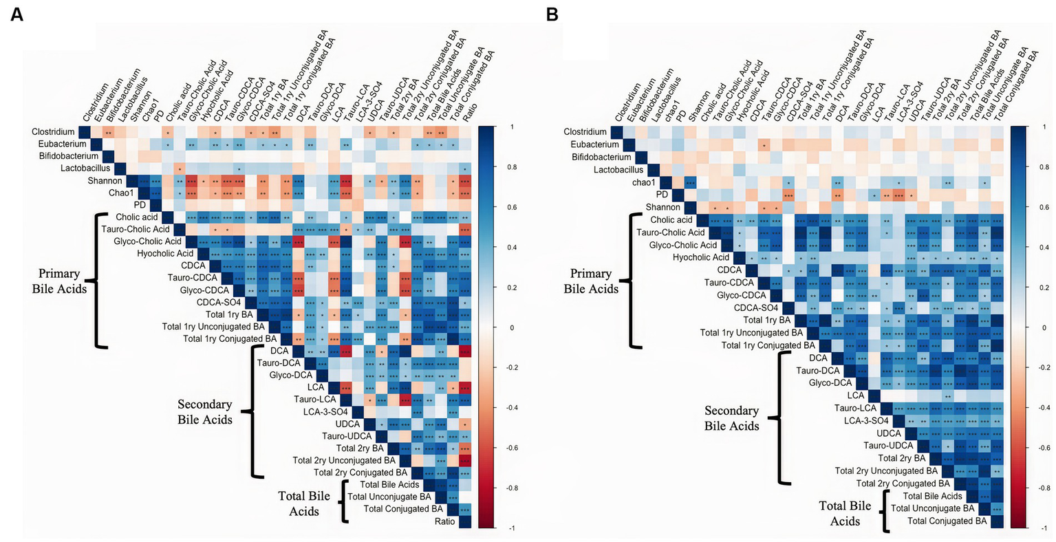 Spearman rank correlation analysis comparing alpha diversity measures and the bacterial relative abundance with all the individual primary bile acids, secondary bile acids, and their respective unconjugated and conjugated forms in (A) intestinal digesta and (B) intestinal tissue. Data is graphically presented in a square plot heatmap. Correlations are indicated by a color scale denoting whether the correlation is positive (closer to 1, blue squares) or negative (closer to −1, red squares). Statistically significant correlations are indicated by a *. *p ≤ 0.05, **p ≤ 0.01, ***p ≤ 0.001.
