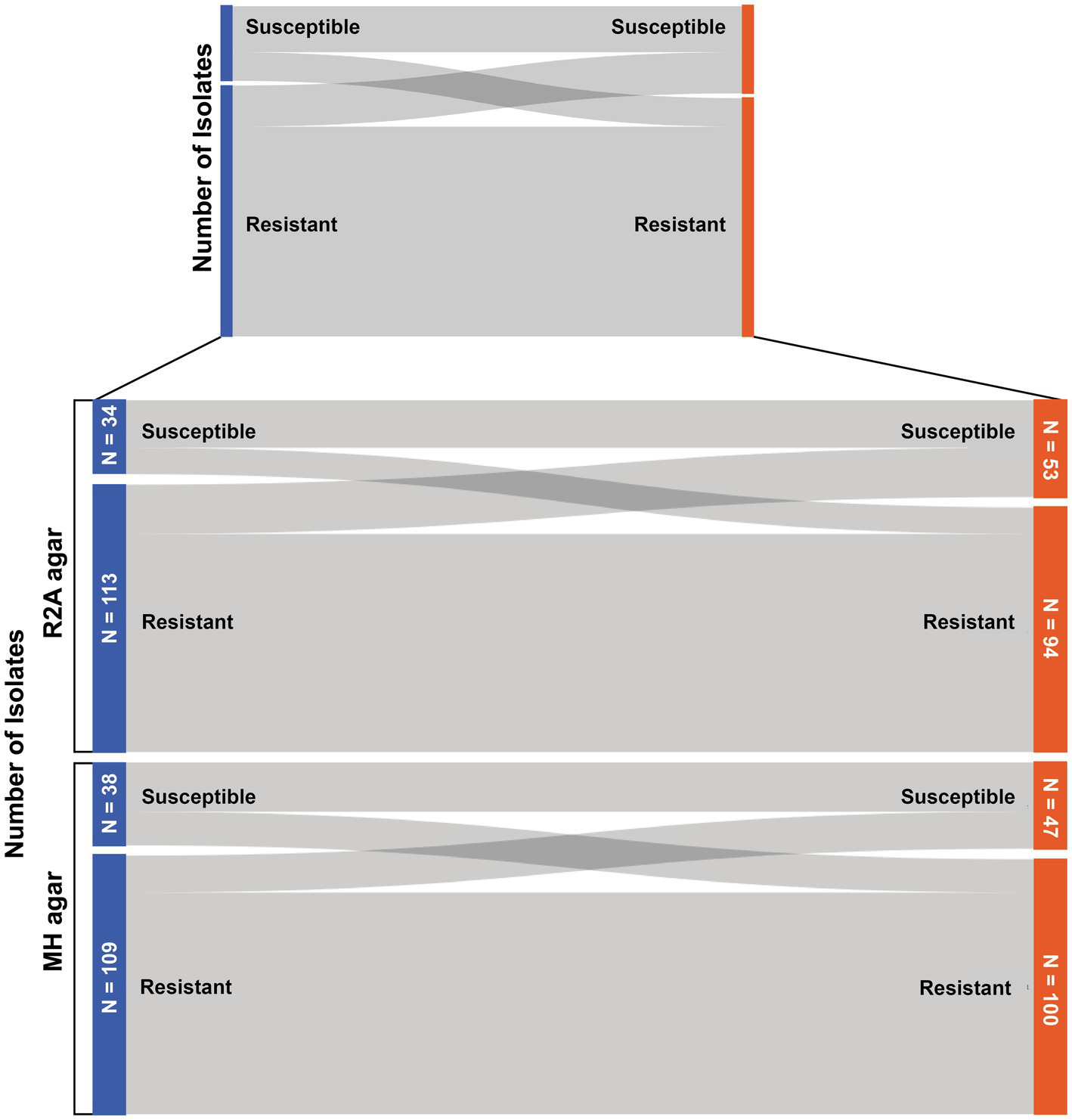 Sankey diagram to display the number of bacteria that changed their resistance status (susceptible/resistant) when tested with the two different antibiotic susceptibility tests.