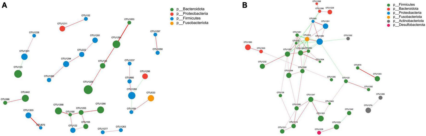 Correlation network analysis of the 50 most abundant OTUs for panel (A) NS and (B) PS. The networks display significant positive (red lines) and negative (green lines) correlations between operational taxonomic units (OTUs). The thickness of the lines represents the magnitude of the correlation coefficient, with thicker lines indicating a stronger correlation between OTUs. The size of the nodes represents the abundance of OTUs. OTUs are colored by phylum affiliation.