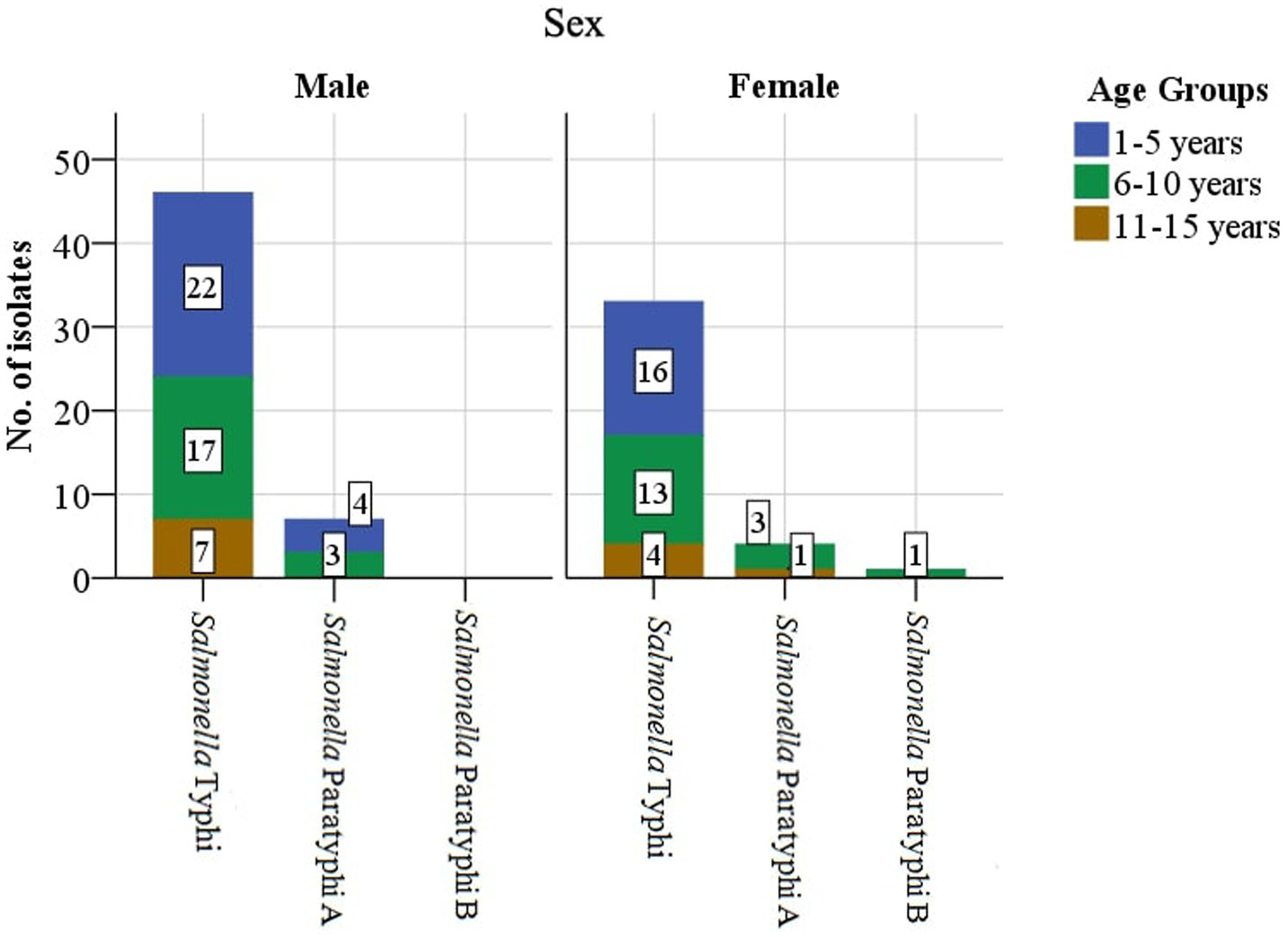 Children in the age group between 1 and 5 years were the most commonly infected (n = 42, 46.1%), with the least among those aged between 11 and 15 years (n = 12, 13.2%), similarly to the findings in India (Das et al., 2016), Pakistan (Rafiq et al., 2009; Britto et al., 2017), and other studies in the series (Mahle and Levine, 1993; Pang et al., 1995). However, this was in contrast (lower, 26.5%, 21.3%, and 14%,) to other publications in Pakistan, Nepal, and India for the age group between 1 and 5 years, respectively (Siddiqui et al., 2006; Budhathoki et al., 2020; Behera et al., 2021). The age-related variation in our findings highlights the possibility of reduced documentation of the disease, poor clinical suspicion, prior antimicrobial treatment before blood culture, and difficulty in withdrawing blood resulting in poor laboratory and clinical outcomes (Britto et al., 2018), along with immunological reasons such as immature and unstable gut microbiome and gut immune function in children between 1 and 5 years of age, easily exposing them to bacterial infections such as S. Typhi in comparison to older ones (Nuriel-Ohayon et al., 2016).