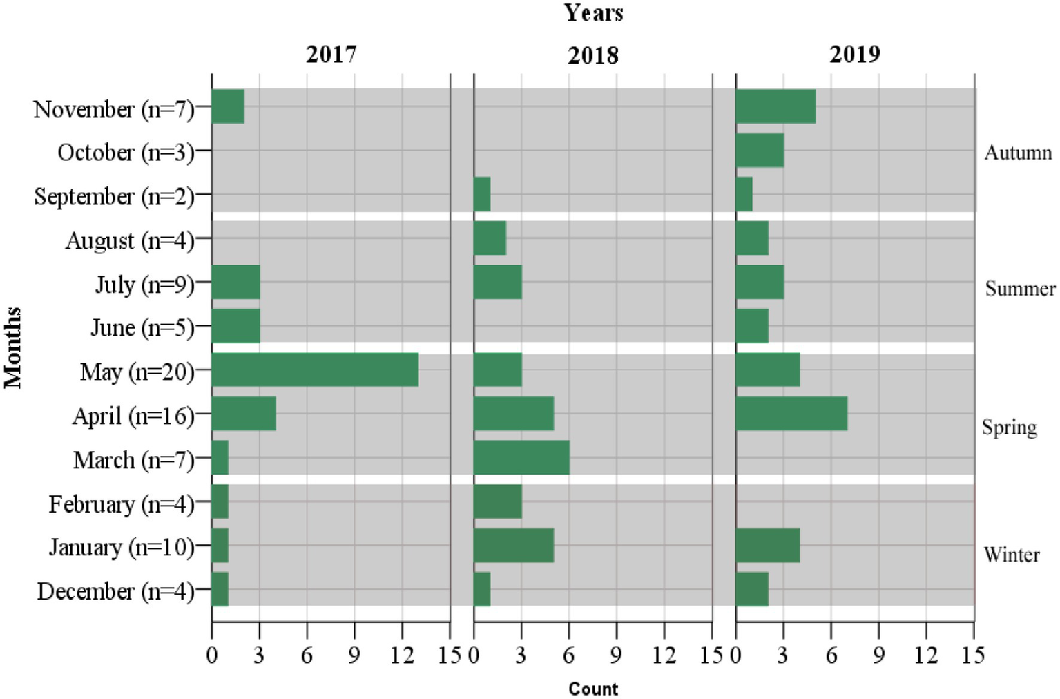 Incidence of enteric fever based on months, seasons, and years (n = 91).