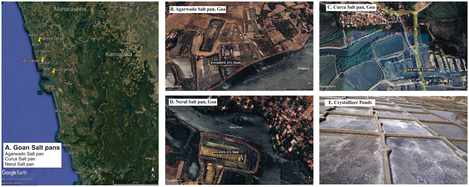 Figure 1. Goan Salt pans in study (A) Location of Agarwado, Curca, and Nerul Salt pans in Goa. Aerial image of (B) Agarwado salt pan (C) Curca salt pan (D) Nerul salt pan [Source: Google earth pro, 2023] (E) Image of crystallizer pond under solar evaporation at Agarwado salt pan.