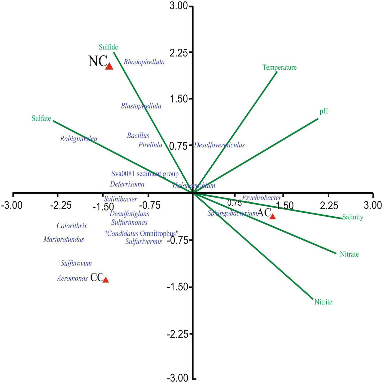 The effect of environmental parameters such as temperature, pH, salinity, nitrite, nitrate, sulfate, and sulfide were assessed on the bacterial genera using CCA. The CCA tripod explained 88.67% of the variation in bacterial genera by environmental parameters (Figure 4). The result revealed the positive correlation between genera Blastopirellula, Sva0081 sediment group, Rhodopirellula, Robiginitalea, Pirellula and Bacillus with sulfide and sulfate. However, genera Psychrobacter, Halanaerobium, Planococcus and Sphingobacterium found abundant in AC were positively correlated with nitrite, nitrate, and salinity. Of all the environmental parameters sulfide and sulfate contributed significantly to bacterial genera in NC.