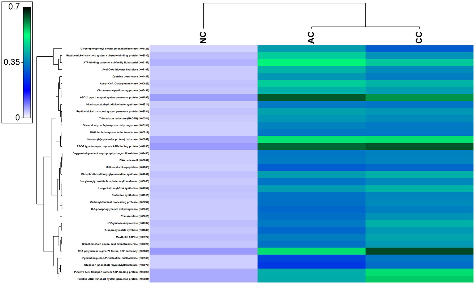 Figure 7. Heatmap showing the abundant functional genes predicted by using PICRUST2 algorithm in the sediment samples of Agarwado salt pan (AC), Curca salt pan (CC), and Nerul salt pan (NC) of Goa, India.