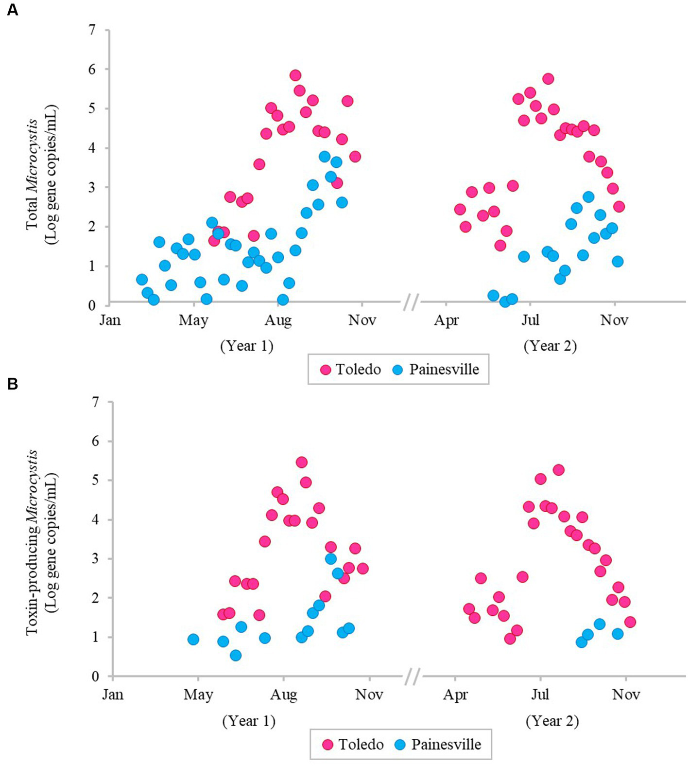 Temporal changes of population of total Microcystis (A) and toxin-producing Microcystis (B) in source water from the bloom site (Toledo) (dark pink) and the control site (Painesville) (blue).