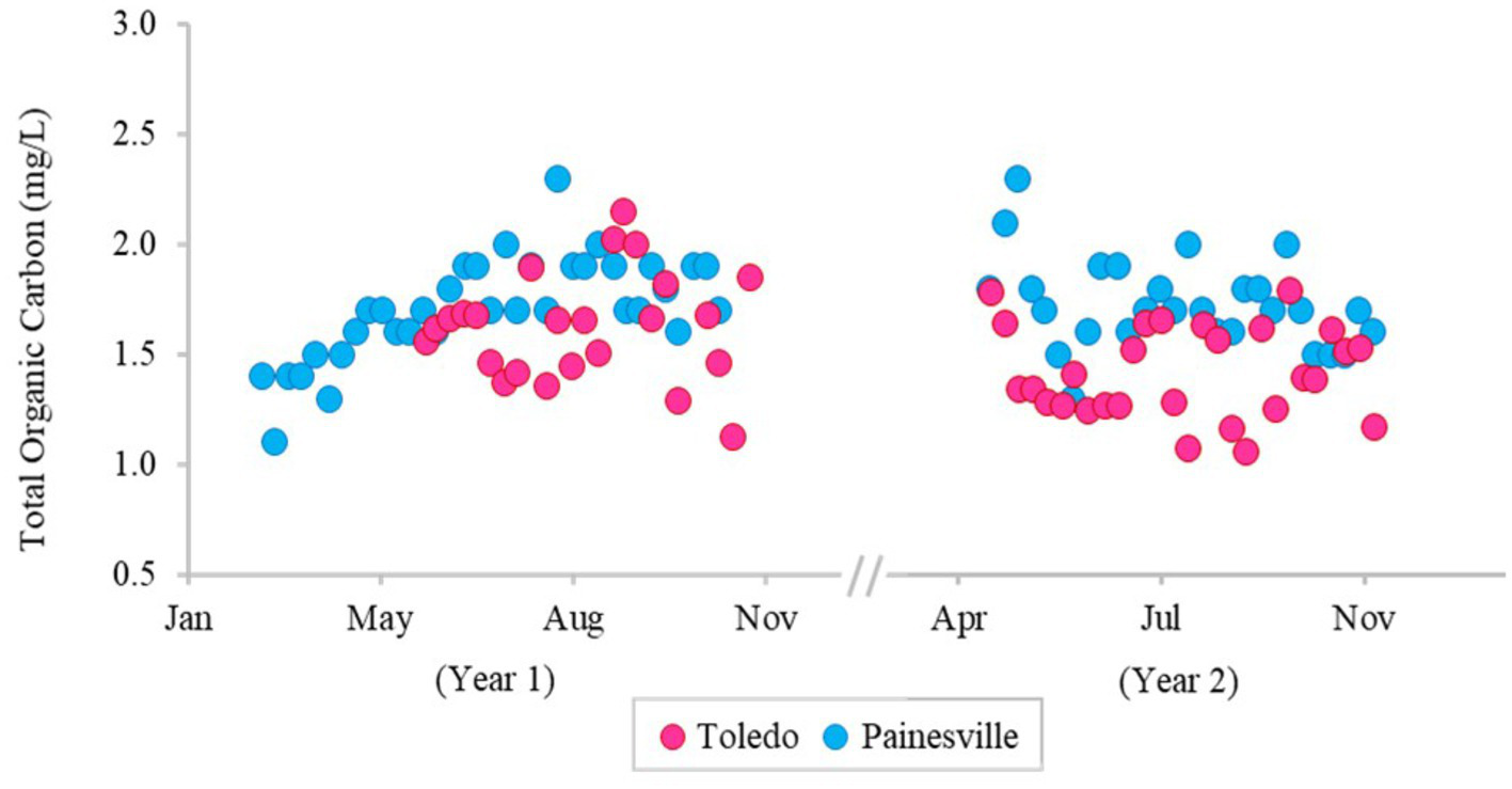 Temporal change of concentration of total organic carbon in the finished water of the bloom site (Toledo) (dark pink) and the control site (Painesville) (blue).
