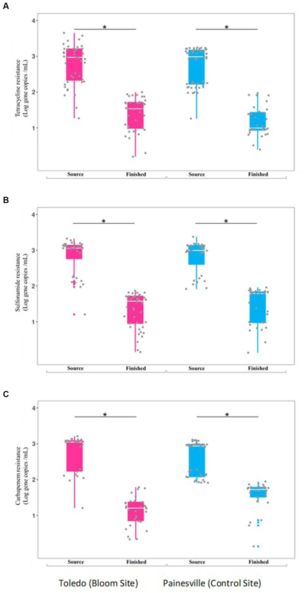 Concentrations of antibiotic resistance genes [tetQ (A), sull (B), and blak PC (C)] in source and finished waters from the bloom site (Toledo) (dark pink) and the control site (Painesville) (blue). *p < 0.05.