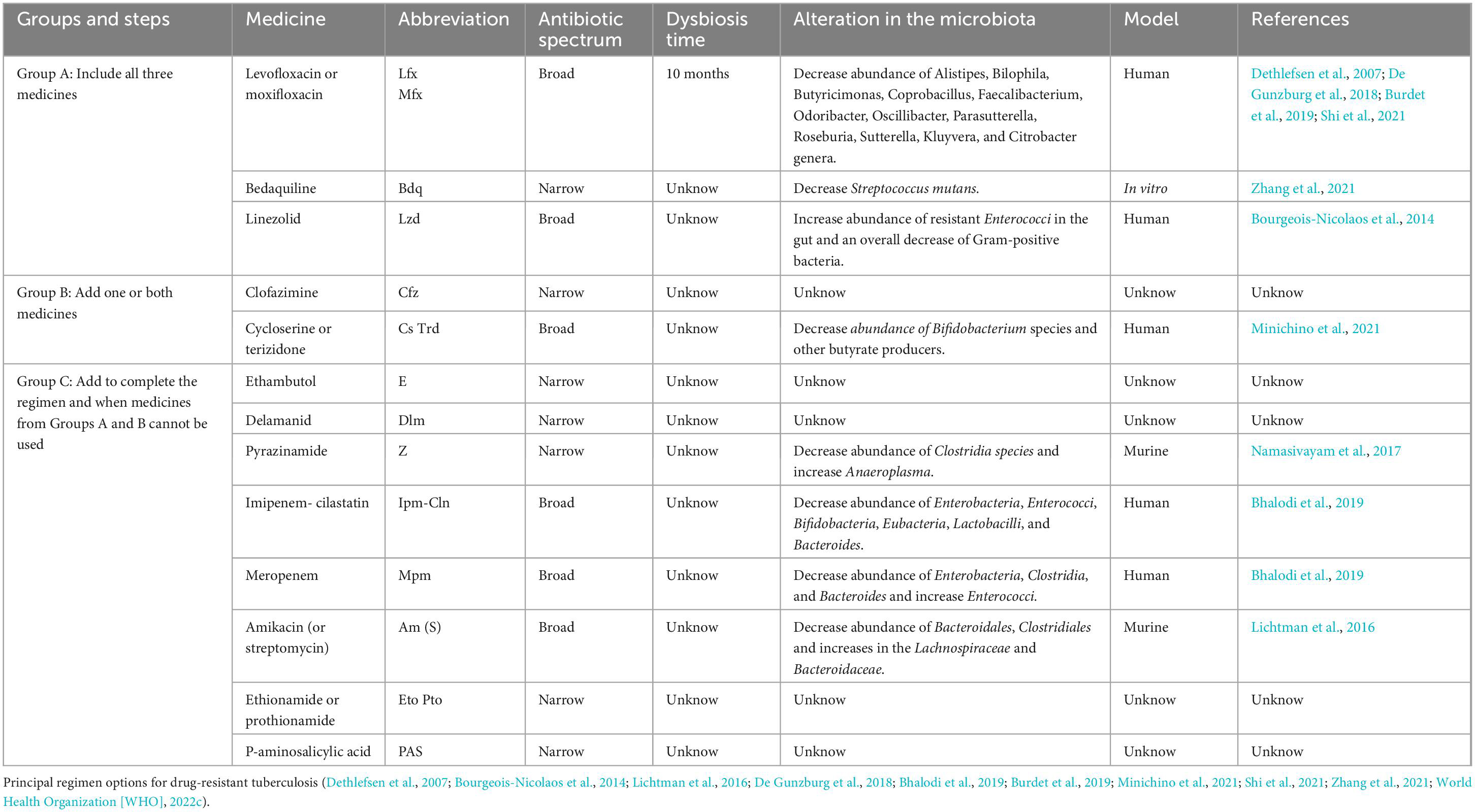 The WHO standard recommended scheme for DS MTB consists of four essential drugs designated as “first-line” anti-TB treatment: isoniazid (H), rifampicin (R), pyrazinamide (Z), and ethambutol (E) for 2 months, followed by 4 months of only HR; recently the WHO added moxifloxacin (Mfx) and rifapentine (Rpt, a synthetic derivative of rifampicin) to primary treatment. Rifampicin, and moxifloxacin are broad-spectrum antibiotics used in other non-mycobacterial infections, whereas isoniazid, pyrazinamide and ethambutol have mycobacterial-specific targets. Two alternative DS treatments have been recently approved by WHO; one includes a 2-month treatment of Rpt, moxifloxacin (Mfx), H and Z followed by 2 months with RptHMfx (Dorman et al., 2021; World Health Organization [WHO], 2022c), and the second one, a 2-month treatment of bedaquiline (Bdq), Linezolid (Lzd) and HZE, which recently proved their effectiveness in clinical trials (Paton et al., 2023). Both of these new alternative treatments significantly decrease the time of treatment but contain broad-spectrum antibiotics (Lzd and Mfx) that result in broader damage to gut microbiota and should be evaluated accordingly (Dorman et al., 2021; Paton et al., 2023).
