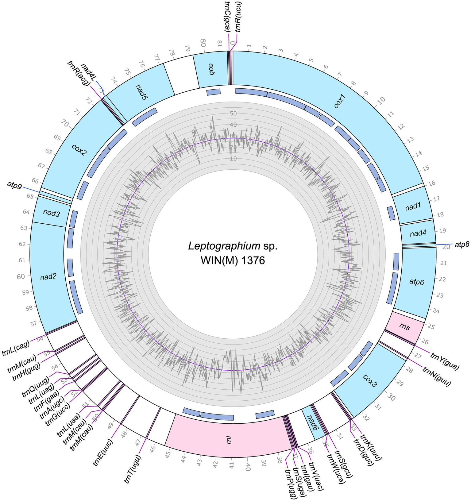 The mitogenomes of L. aureum WIN(M)809, Leptographium sp. WIN(M)1376, and Grosmannia fruticeta WIN(M)1600, are represented as circular molecules and are illustrated in Figures 1–3, respectively. These vary in size with L. aureum at 104,547 bp, L. sp. WIN(M)1376 at 81,823 bp, and G. fruticeta at 63,821 bp. Based on the program GetOrganelle vs. 1.7.5 the coverage for the three mitogenomes were as follows: 2,491 fold for L. aureum, 1,555 fold for WIN(M)1376, and 1,409 fold for G. fruticeta. All three genomes encode the ribosomal RNA genes rns and rnl, the mitochondrial core set of protein-coding genes (atp6, atp8, atp9, cob, cox1–3, nad1–6, nad4L, and rps3). Like other members of the Ophiostomatales (and members of the Sordariomycetes) the ribosomal protein RPS3 is encoded within a Gr I intron embedded within the rnl gene (reviewed in Wai et al., 2019). The presence of atp9 was noted for all three genomes and these also encode a set of tRNAs that cover all 20 standard amino acids. The mitogenomes for L. aureum and L. sp. WIN(M)1376 encode 26 tRNA genes and the G. fruticeta genome encodes 25 tRNAs genes. The gene order and orientation for all three genomes is identical and the same as previously reported for members of the Ophiostomatales (Wai and Hausner, 2021; Zubaer et al., 2021): cox1, nad1, nad4, atp8, atp6, rns, cox3, nad6, rnl, nad2, nad3, atp9, cox2, nad4L, nad5, cob (Figure 4). For L. aureum and L. sp. WIN(M)1376 the nad4L and nad5 genes are separated by one nucleotide and the nad2 and nad3 genes are “fused” although they are separated by a stop (TAA) codon. In G. fruticeta the nad4L and nad5 genes overlap by one nucleotide and the nad2 and nad3 genes are fused as described for L. aureum and L. sp. WIN(M)1376.