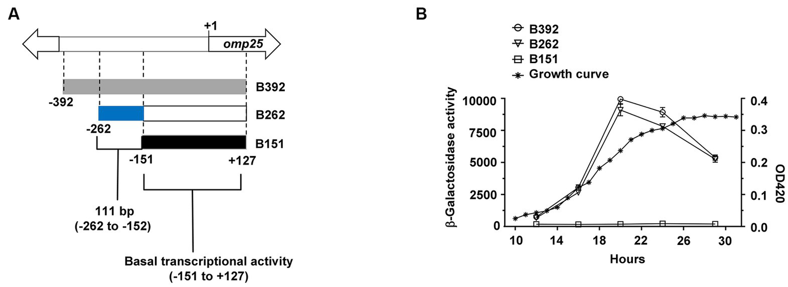 In B. abortus 2308 W, the omp25 upstream intergenic region comprises 401 nucleotides (Suárez-Esquivel et al., 2016). To characterize the minimal promoter region of omp25, we constructed three plasmid-borne omp25-lacZ reporter fusions harboring 392-, 262-, and 151-bp upstream of omp25, respectively. All three reporter fusions included the first 127-bp of the omp25 coding sequence (Figure 1A). The resulting plasmids were introduced into B. abortus 2308 W-generating strains B392, B262, and B151. Then, we assayed the β-galactosidase activity of each resulting strain at different time points of the growth curve. We used strain 3aZ, carrying a transcriptional chromosomal fusion Pomp3a::lacZ, as the positive control (Table 1). The strain B392 exhibited similar β-galactosidase activity compared to strain 3aZ, except for the late log phase of the growth curve (Supplementary Figure 1; Supplementary Table 3). The strains B392 and B262 reached a peak of β-galactosidase activity at mid-log phase, between 18 and 22 h of growth, without significant statistical differences along the curve (Figure 1B; Supplementary Table 3). However, strain B151, harboring 111-bp less than B262 (Figure 1A), presented significantly reduced β-galactosidase activity compared to B262 and B392. Yet some basal transcriptional activity was observed in this strain at all time points tested, as compared to the empty vector activity (Supplementary Table 3). Therefore, the omp25 promoter region is located between coordinates −262 and + 127 from the start codon, and the additional 111-bp region in B262 (−262 to −152), as compared to B151, is needed for wild-type transcriptional levels.
