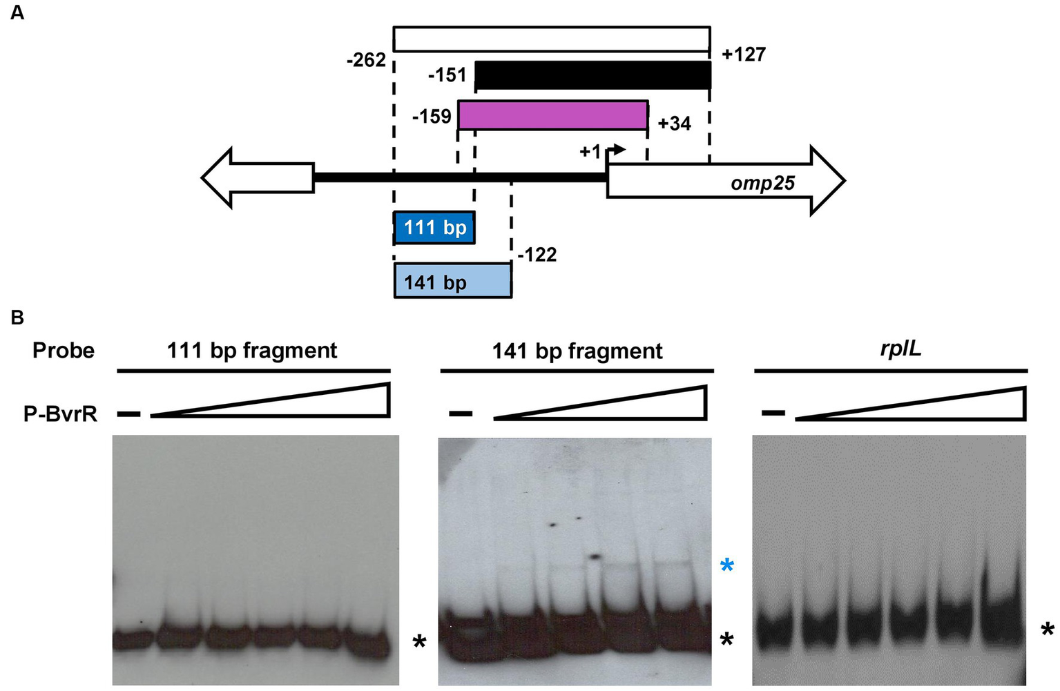 A P-BvrR binding site is inferred by EMSA from −152 to −122. (A) Schematic representation of the omp25 intergenic studied region. White rectangle = fragment displaying wild-type levels of transcription (−262 to +127), black rectangle = fragment displaying basal transcriptional activity (−151 to +127), purple rectangle = fragment previously known to bind to P-BvrR by direct EMSA (−159 to +34), blue rectangle = 111-bp fragment (from −262 to −152) needed to enhance transcription and tested as a probe by direct EMSA with P-BvrR, and light blue rectangle = larger fragment of 141-bp (from −262 to −122), comprising 30 additional downstream bp. (B) Direct EMSA results were obtained when using increasing concentrations of P-BvrR from 0.1 to 1.6 μM and one of the following labeled probes: the 111-bp fragment from −262 to −152 (left gel) and the 141-bp fragment from −262 to −122 (middle gel). A 290-bp DNA fragment from the coding region of the ribosomal gene rplL (right gel) was used as a specificity P-BvrR binding control. Lanes marked as “-” contain the probe without P-BvrR. Blue asterisks = shifted bands (protein-DNA complexes) selected based on the following criteria: absence in the negative control, P-BvrR concentration dependency, and consistency between independent replicas. Black asterisks = bands with the migration pattern of a free probe. These results are representative of at least three independent experiments.