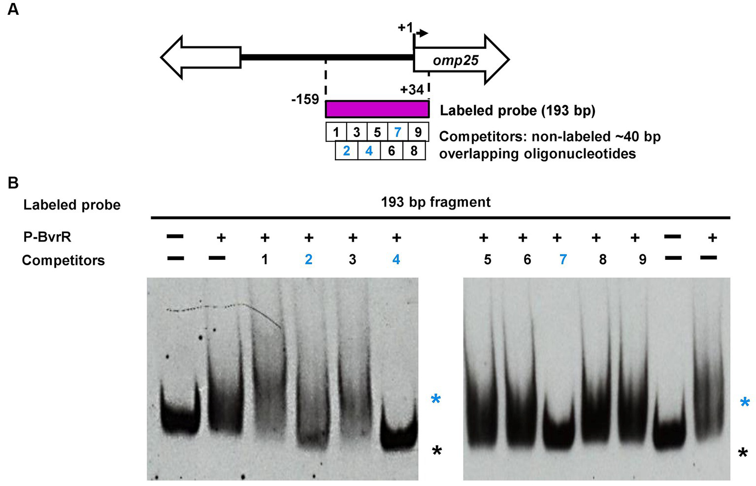 Competitive EMSA results suggest the presence of three putative P-BvrR binding sites on the upstream studied region of omp25. (A) Schematic representation of the DNA fragments from the omp25 upstream region that were analyzed in competitive EMSA with P-BvrR. The 193-bp region known to bind to P-BvrR by EMSA (purple rectangle) was used as the labeled probe. This fragment was depicted in nine overlapping 40-bp oligonucleotides that were used as non-labeled competitors (white squares). Numbers in blue = competing oligonucleotides, showing the position of the three putative binding sites. (B) Competitive EMSA results, using the 193-bp fragment (−159 to +34) as the labeled probe, P-BvrR (0.4 μM), and an excess (1,000×) of the nine different competitors tested. Lanes marked as “−” contain probes without P-BvrR. Blue asterisks = shifted bands (protein-DNA complexes) selected based on the following criteria: absence in the negative control, P-BvrR concentration dependency, and consistency between independent replicas. Black asterisks = bands with the same migration pattern as a free probe. For oligonucleotides 4 and 7, a clear competition was observed. In the case of oligonucleotide 2, a less defined lower band suggested possible competition. These results are representative of at least three independent experiments.