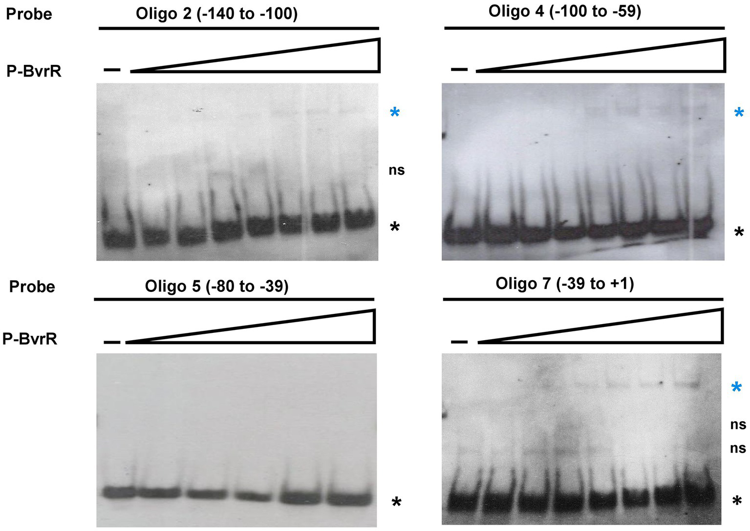 Direct EMSA results confirm the presence of three specific P-BvrR binding sites on the upstream region of omp25. The competing oligonucleotides 2, 4, and 7, and the non-competing oligonucleotide 5 (specificity control for P-BvrR binding) were labeled and incubated with increasing concentrations of P-BvrR (0.1 to 1.6 μM). Lanes marked as “-” contain probes without P-BvrR. Blue asterisks = shifted bands (protein-DNA complexes) selected based on the following criteria: absence in the negative control, P-BvrR concentration dependency, and consistency between independent replicas. Black asterisks = bands with the same migration pattern as a free probe. “ns” = non-specific bands. These results are representative of at least three independent experiments.