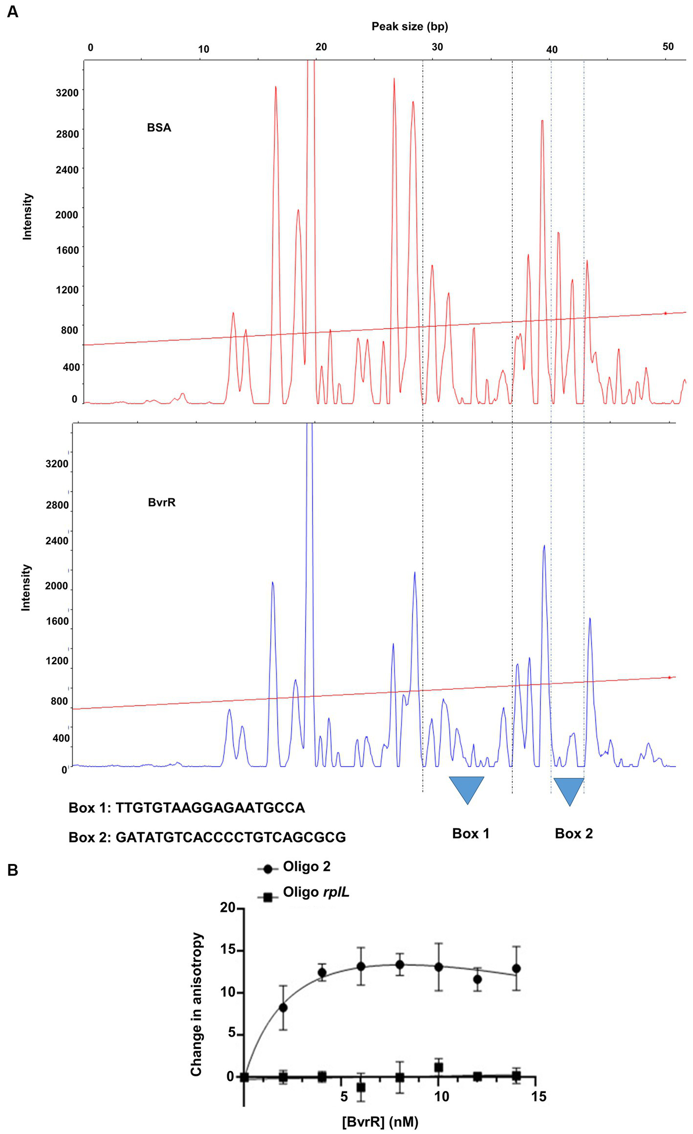Confirmation of BvrR binding sites by additional experimentation. (A) DNase I footprinting analysis of the omp25 upstream fragment (193-bp, −159 to +34). The Peak Scanner software inferred the protected regions by analyzing the electropherograms from digested DNA with 3.64 nM BSA (upper panel) or 8.32 μM P-BvrR (bottom panel). Base pair positions were inferred from the Sanger sequencing of the 193-bp fragment compared to the DNAse I protected regions. Two protected DNA regions of approximately 20 nucleotides between positions −18 to +1 (box 1) and − 99 to −76 (box 2), matching the oligonucleotides 7 and 4, are shown. The straight red line across each electropherogram represents the molecular size calibration obtained with molecular weight markers run together with the samples. (B) Fluorescence anisotropy analysis. The oligonucleotide 2 and a smaller fragment of the negative control used for EMSA were labeled with FAM and separately incubated with P-BvrR. The fluorescence anisotropy of each sample was measured, and the obtained curves show a positive change for the oligonucleotide 2 compared to the negative control. This result, combined with the EMSA results shown in Figures 2–4, allowed us to delimit box 3 to the region between −140 and − 122. These results are representative of at least two independent experiments.