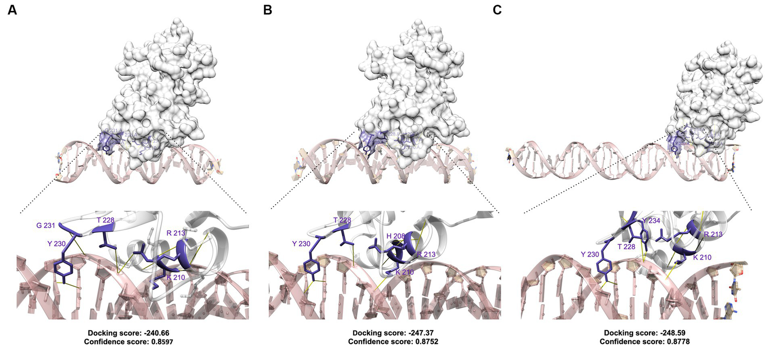To investigate the theoretical interaction between BvrR and the three DNA regulatory boxes confirmed by different experimental approaches including direct and competitive EMSAs, DNase I footprinting, and fluorescence anisotropy, we performed molecular docking using the HDOCK web server. The quality report of the homology modeling showed that the BvrR model falls within the range of low to medium based on the Seq_ID (Supplementary Table 4). However, based on the TMscore, the model demonstrates high quality (Supplementary Figure 2). Similarly, upon comparing HDOCK’s BvrR model with models generated by SWISS-MODEL, I-TASSER, and AlphaFold using standard quality parameters, we observed only minimal differences among the models (Supplementary Table 5), suggesting that despite its low identity to the template, the model generated by HDOCK shares similarities with those produced by other widely used software.