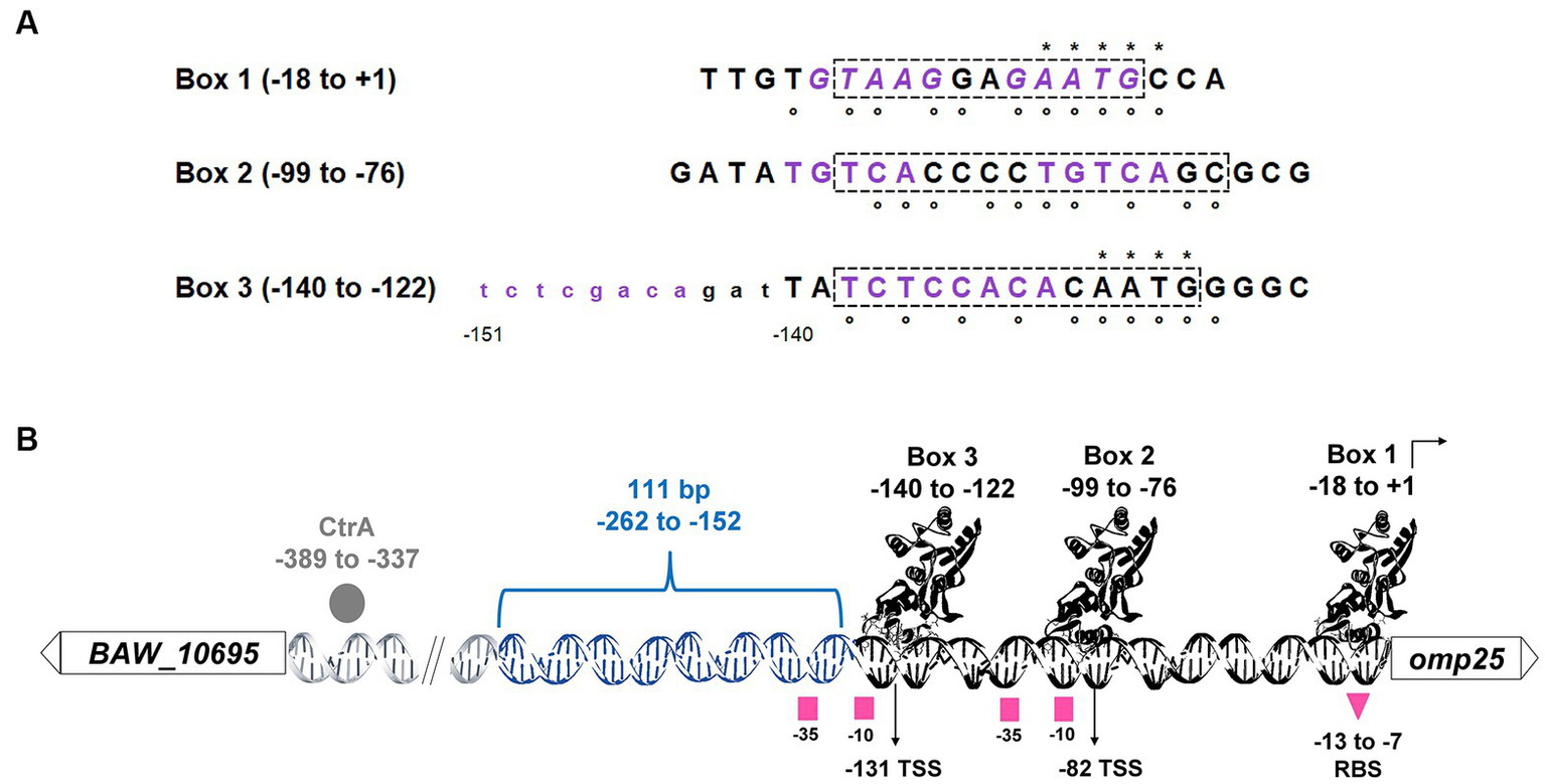 A direct interaction has been described between BvrR and the upstream region of omp25, located between coordinates −159 and + 34 from the start codon (Rivas-Solano et al., 2022). Two transcriptional start sites (TSS) have been independently reported for omp25, at positions −131 and − 82 (Suárez-Esquivel et al., 2016; Rivas-Solano et al., 2022).