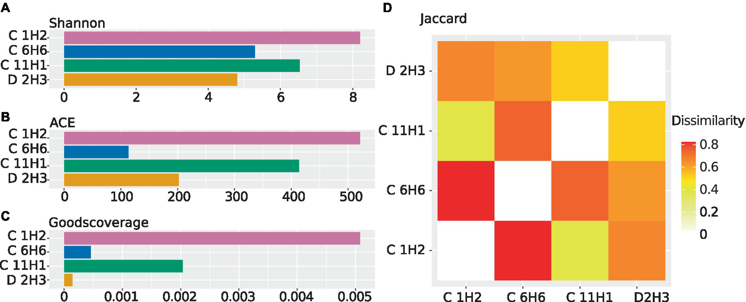 Alpha and beta diversities calculated from the abundance of contigs carrying 16S rRNA genes using ExpressBetaDiversity (Parks and Beiko, 2012). The 16S rRNA sequences used for diversity analysis were predicted from the contigs of the co-assembled metagenomes, and abundances were estimated by mapping the individual sample’s reads back onto the co-assembly. (A) Shannon diversity as a barplot. The diversity within the samples is shown while considering species abundance. The Shannon index weighs the abundance of highly abundant species higher. (B) ACE diversity as a barplot. The diversity within the samples is shown while considering species abundance. The ACE index places an additional focus on less abundant species. (C) Good’s coverage as a barplot. The estimated completeness of a sample is displayed as the negative decadic logarithm of the Good’s coverage, meaning that lower values indicate higher estimated completeness. (D) Jaccard diversity for every sample to every other sample as a heatmap. Displayed is the inverse of the similarity between every sample, meaning that two identical samples would have a dissimilarity of “0”.