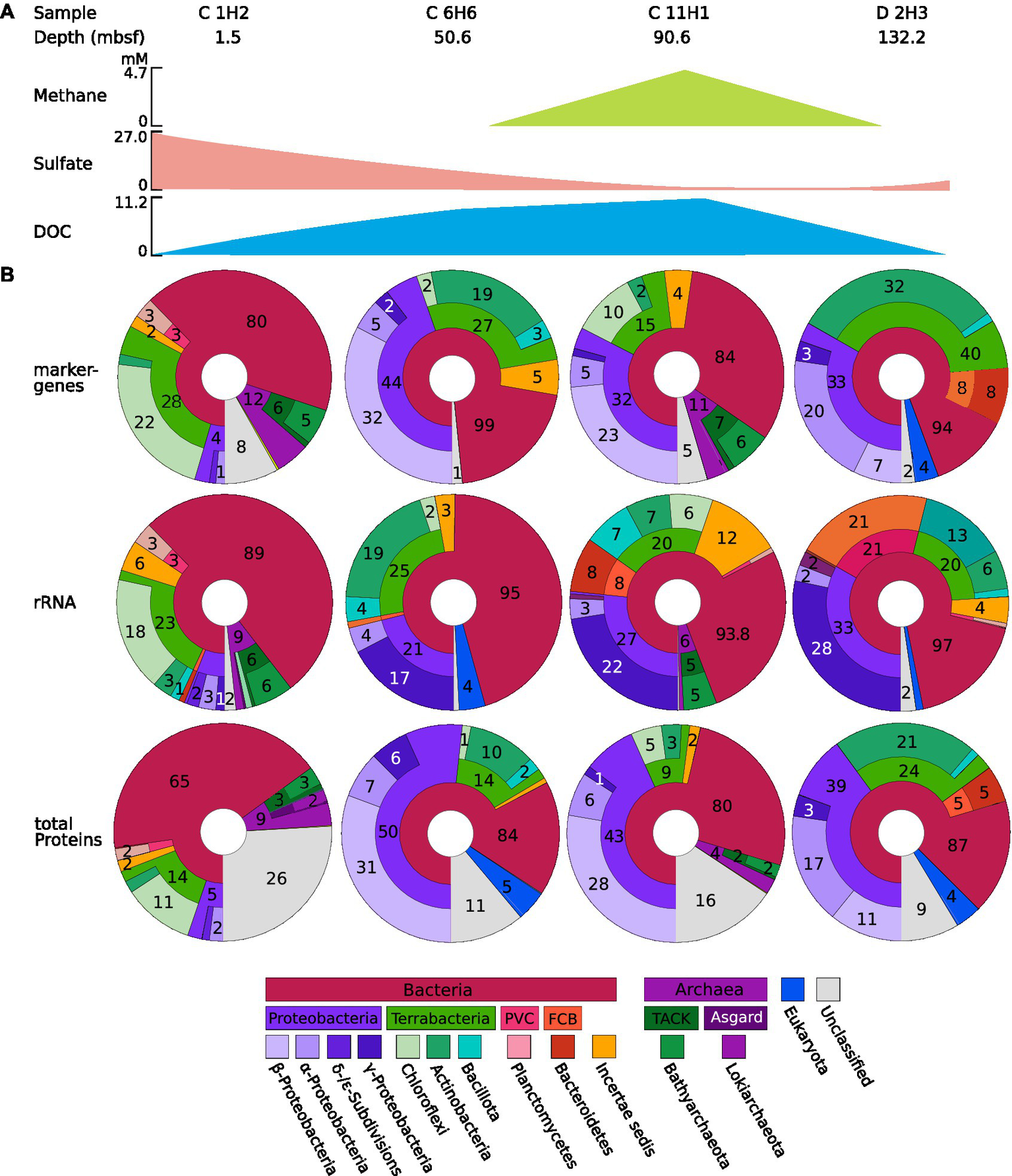 (A) Information on the sample and key chemical components. The concentrations of methane, sulfate, and dissolved organic carbon (DOC) are shown as a simplified scheme; for a more detailed graph, see Figure 1. (B) Microbial abundance profiles of the four samples C1H2, C6H6, C11H1, and D2H3 based on rRNA, protein, and marker gene classification from IODP site U1301. Marker genes, 16S rRNA, and protein predictions were performed using the co-assembled metagenome, and their abundance within the original sample was determined using short-read mapping data. Classifications were obtained using the QIIME2 (Bolyen et al., 2019) classification outlined in the methods for 16S rRNA and by alignment against NCBI GenBank Release 235 for total protein predictions and marker gene predictions. Displayed are the classifications of identified sequences up to domain, phylum, and class, sequences that cannot be classified are displayed as part of the next higher level with no label. Sequences that cannot be attributed to a Domain are labeled as “unclassified.” CPR = Candidate Phyla Radiation. The Krona charts corresponding to the depicted figures can be found in Supplementary Data 2–4.