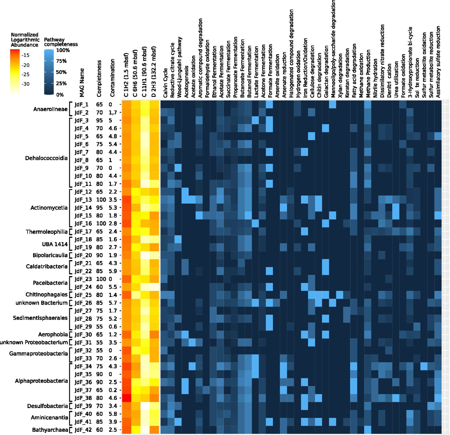 A stratification for sulfate-metabolizing microorganisms along the chemical stratification outlined in the introduction was observed. According to 16S rRNA gene analysis, Desulfobacteria were found in the topmost sample C 1H2 at 2% of total 16S rRNA gene abundance and in the basement-influenced sample D 2H3 at 1% of total 16S rRNA gene abundance. Their abundance dropped within the anaerobic layer sample C 11H1 to 0.7% and could not be detected within the SMTZ sample C 6H6. MAG JdF_39, which was taxonomically most closely related to a Desulfobacterium, had a pathway completeness of 80% for dissimilatory sulfate reduction.