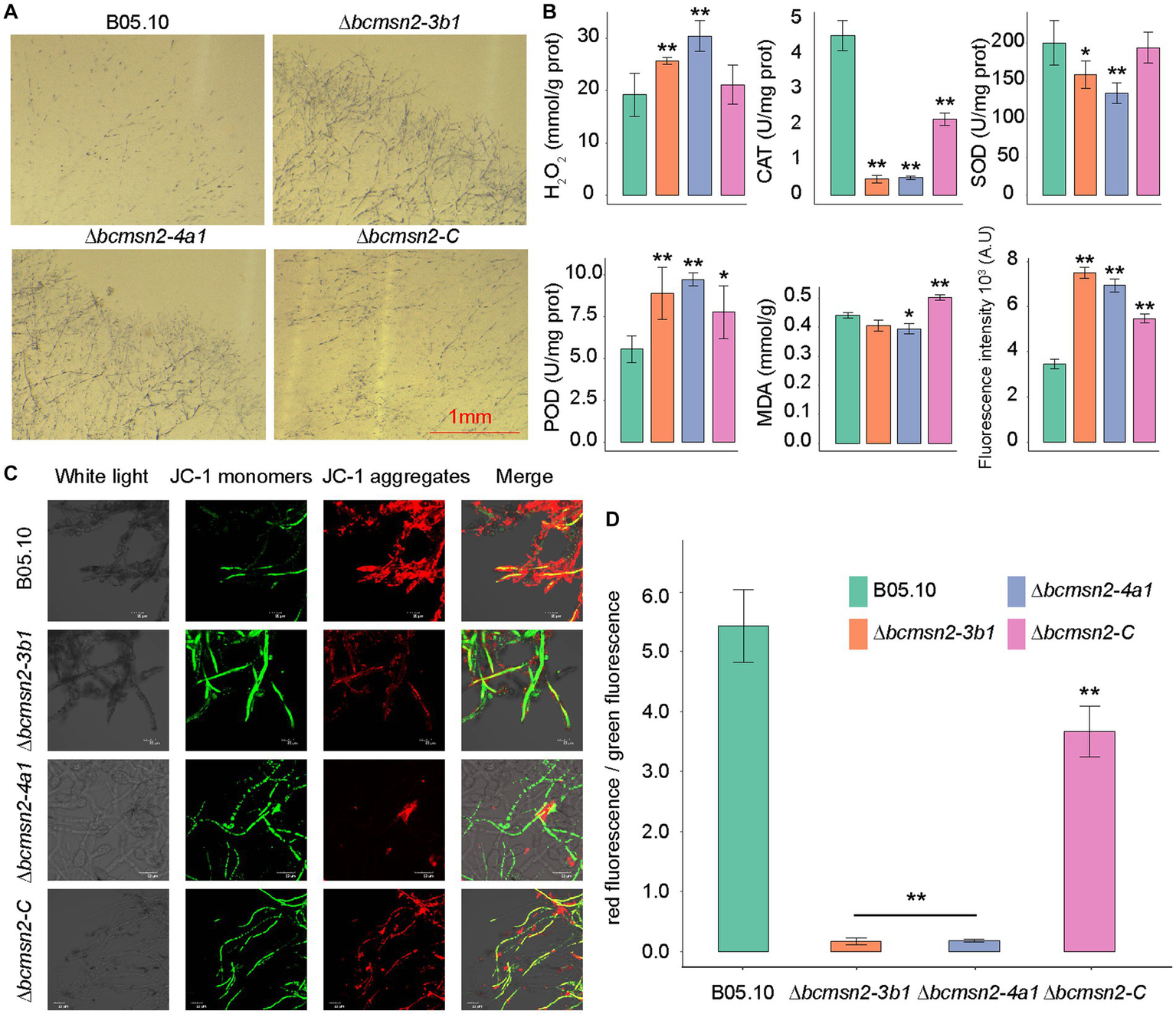 ∆bcmsn2 displayed a higher H2O2 content, increased POD activity, decreased CAT and POD activities, higher ROS levels, and lower mitochondrial membrane potential than the WT and ∆bcmsn2-C. (A) Each strain at 3 days old was stained with 0.05% NBT. Bar = 1 mm. (B) Comparisons of H2O2, CAT, SOD, POD, MDA, and ROS among the WT, ∆bcmsn2, and ∆bcmsn2-C after incubation in PDB for 4 days. (*p< 0.05, **p < 0.01). (C) Detection of mitochondrial membrane potential using the laser scanning confocal microscope. (D) Relative ratio of red/green fluorescence after JC-1 dye.