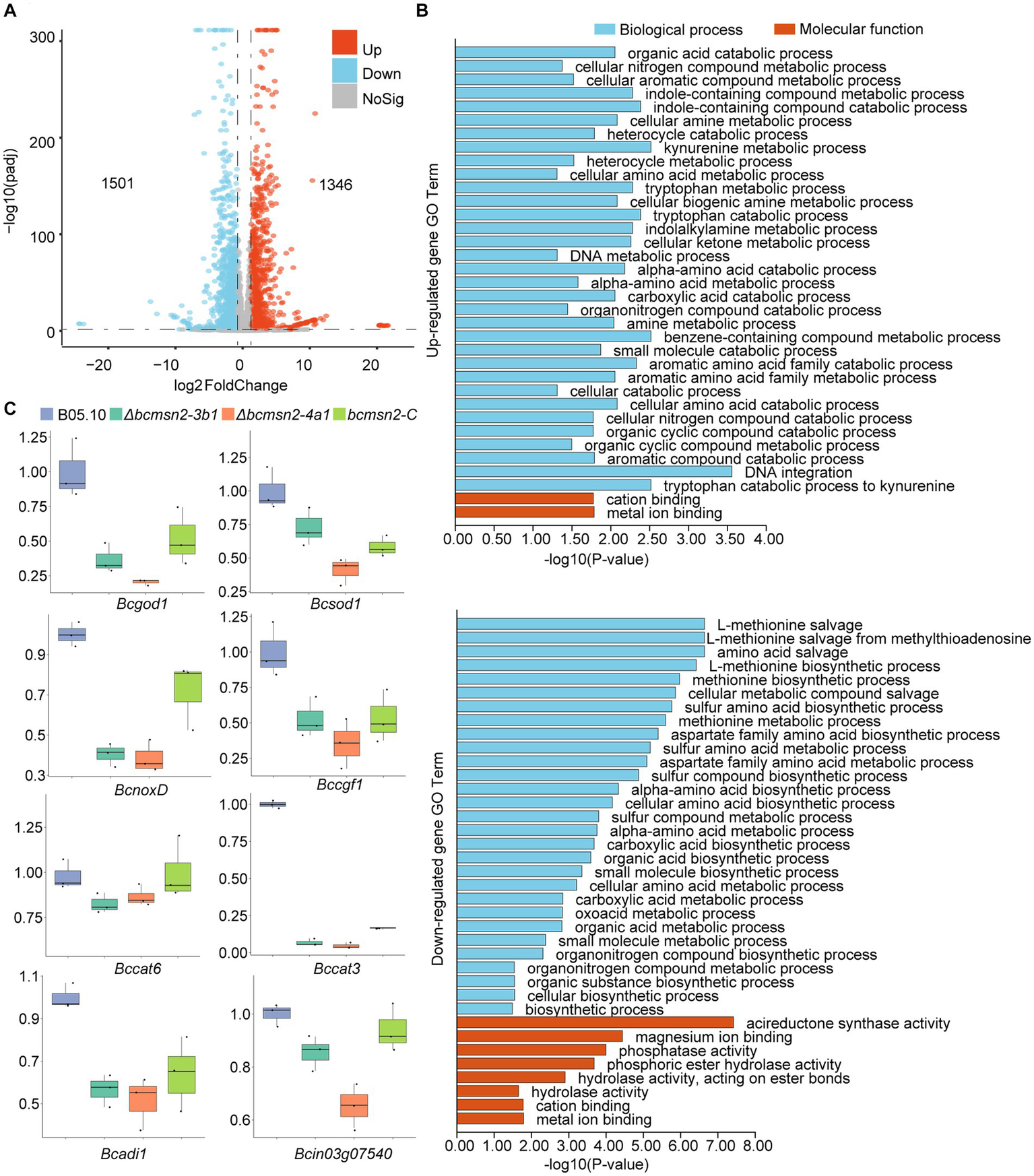 RNA-Seq analysis of the ∆bcmsn2 strain. (A) Volcano plot of the significantly upregulated and downregulated genes in the ∆bcmsn2 mutant (|log2 Fold Change| ≥ 1, p-value <0.05) compared with those in the wild-type. The numbers of differentially expressed genes were calculated with data from two biological replicates. (B) Enriched gene ontology (GO) terms associated with the upregulated and downregulated genes in the ∆bcmsn2 mutants. (C) qRT-PCR detection of the expression of ROS-related genes.