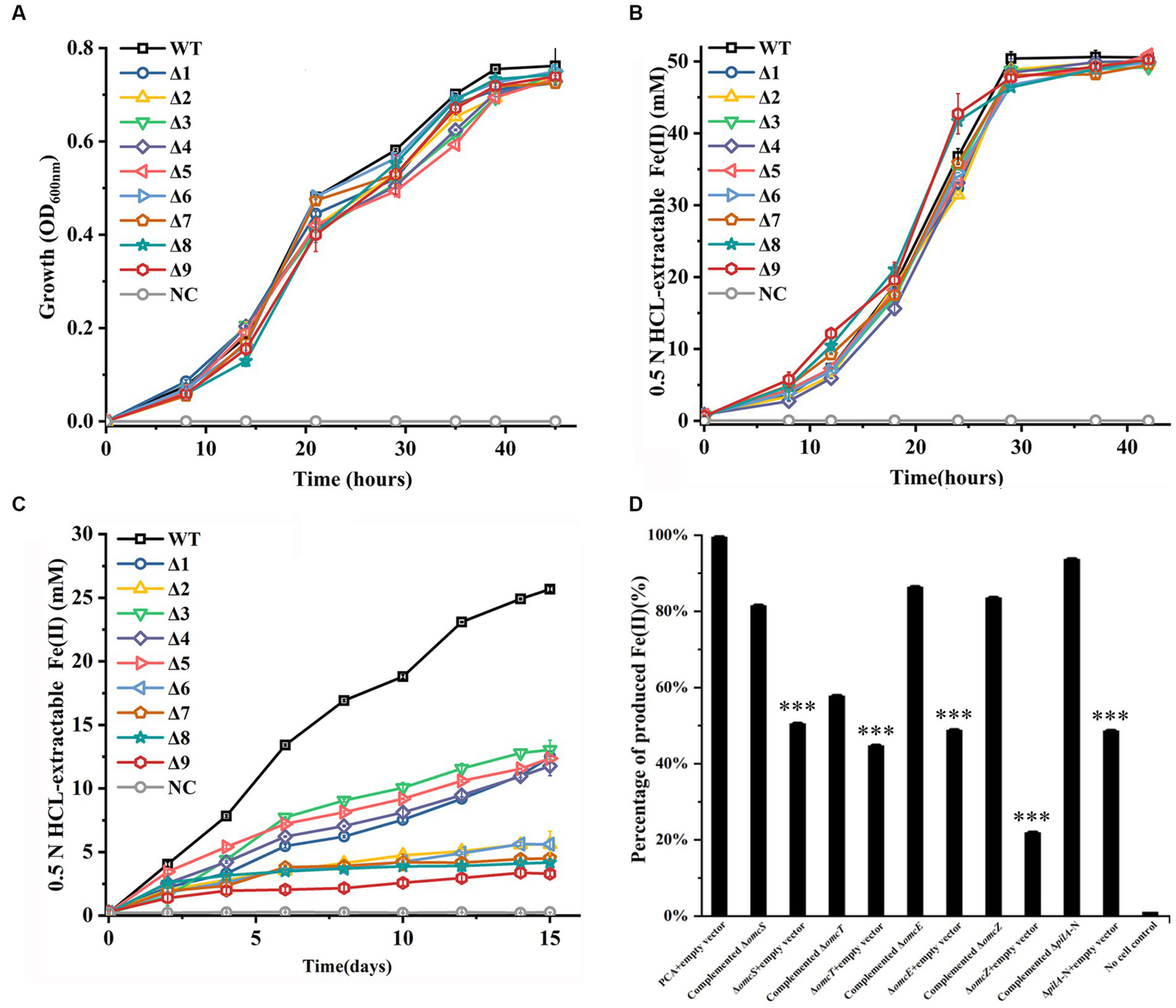 Growth with fumarate and reductions of Fe(III)-citrate and ferrihydrite by the constructed mutants of Geobacter sulfurreducens. (A) Growth with fumarate as the sole terminal electron acceptor. (B) Fe(III)-citrate reduction. (C) Ferrihydrite reduction over 15 days. (D) Complement of single-gene-deletion mutants for ferrihydrite reduction. The reductions were carried over 15 days. The shown are those at 15 days after reduction. WT, wild-type of G. sulfurreducens; Δ1, ΔomcS; Δ2, ΔomcT; Δ3, ΔomcE; Δ4, ΔomcZ; Δ5, ΔpilA-N; Δ6, ΔomcSΔomcT; Δ7, ΔomcSΔomcTΔomcZ; Δ8, ΔomcSΔomcTΔomcZΔomcE; Δ9, ΔomcSΔomcTΔomcZΔomcEΔpilA-N; NC, no cell control. The values plotted at each time point are the average OD600(A) and 0.5 N HCl extractable Fe(II) (B,D) measured for each strain (n = 3), respectively, and error bars are standard deviations. For points with no error bar, the error was smaller than the size of the symbol. In (D), the results are reported as the percentage of activity relative to that observed with PCA + empty vector and standard error of the mean (n = 3). Student’s t test was used for comparing complement strains and their respective control groups. ***, p ≤ 0.001.