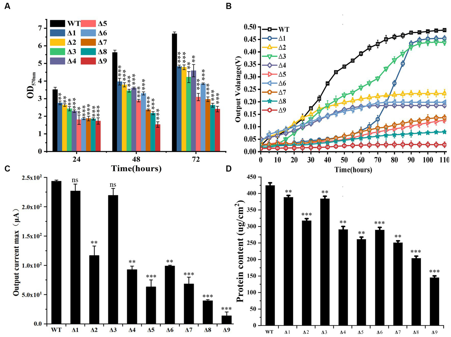 Biofilm formation and anode reduction by the constructed mutants of Geobacter sulfurreducens. (A) Absorbance of crystal violet (OD565) extracted from stained biofilms grown on non-conductive surfaces (n = 3). (B). Output voltage of bacterial strains grown on anodes over 110 h. The values plotted at each time point are the average output voltage measured for each strain from triplicate assays and error bars are standard deviations. For points with no error bar, the error was smaller than the size of the symbol. (C) Maximum output current of bacterial strains grown on anodes at 110 h (n = 3). (D). Bacterial protein contents on anodes at 110 h after growth (n = 3). WT, wild-type of G. sulfurreducens; Δ1, ΔomcS; Δ2, ΔomcT; Δ3, ΔomcE; Δ4, ΔomcZ; Δ5, ΔpilA-N; Δ6, ΔomcSΔomcT; Δ7, ΔomcSΔomcTΔomcZ; Δ8, ΔomcSΔomcTΔomcZΔomcE; Δ9, ΔomcSΔomcTΔomcZΔomcEΔpilA-N. In (A,C,D), Student’s t test was used for comparing WT and the mutants. ns, p > 0.05; *, p ≤ 0.05; **, p ≤ 0.01; ***, p ≤ 0.001.