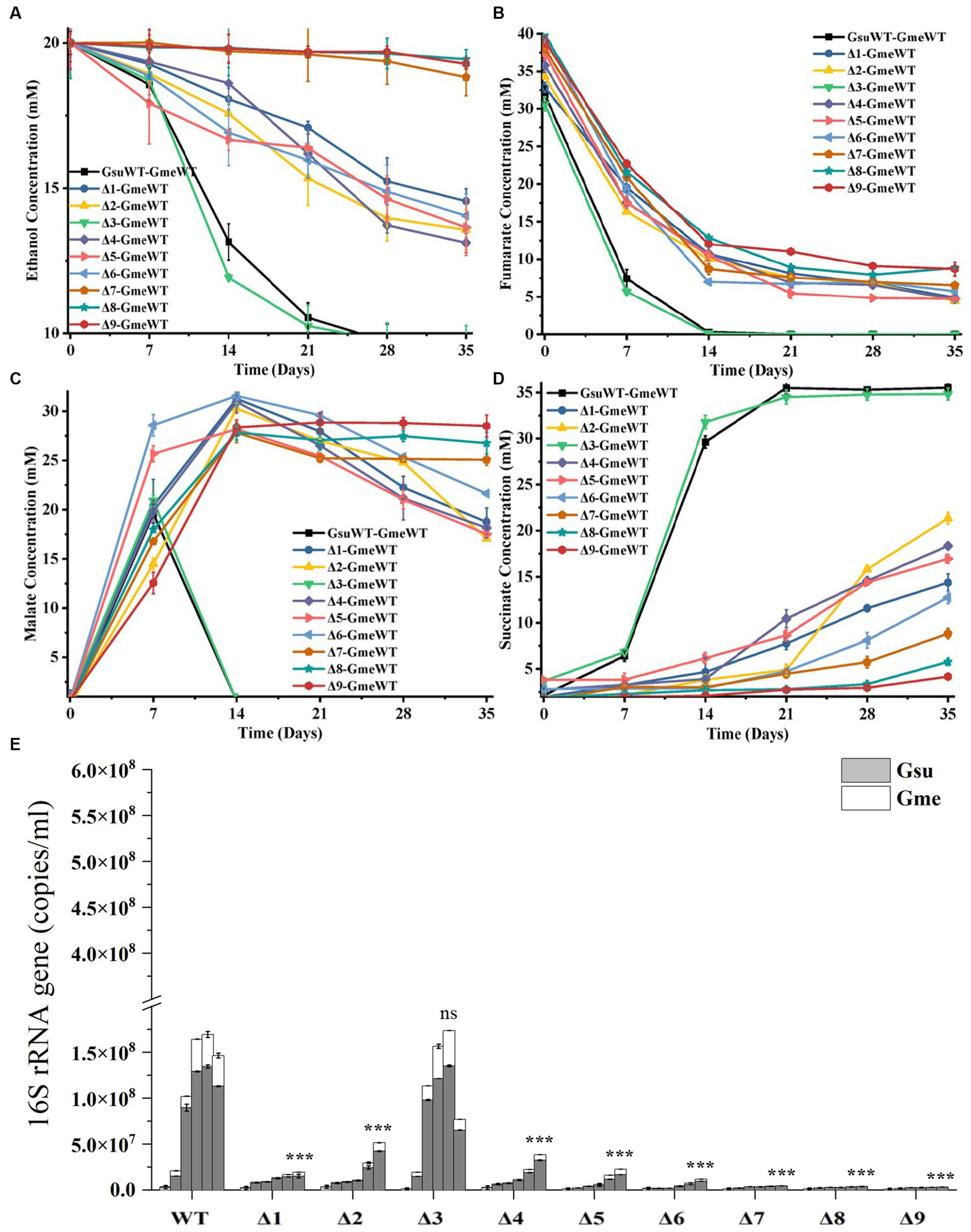 The second generation of co-cultures in the presence of hybL gene of Geobacter sulfurreducens over 35 days. The values plotted at each time point are the average ethanol (A), fumarate (B), malate (C) and succinate (D) measured for each strain (n = 3), respectively, and error bars are standard deviations. For points with no error bar, the error was smaller than the size of the symbol. (E) The copies of combined 16S rRNA genes of Geobacter metallireducens (Gme) and G. sulfurreducens (Gsu) (n = 3). The predetermined time points for sample collections in (E) are the same to those in (A–D). WT, wild-type of G. sulfurreducens or G. metallireducens; Δ1, ΔomcS of G. sulfurreducens; Δ2, ΔomcT of G. sulfurreducens; Δ3, ΔomcE of G. sulfurreducens; Δ4, ΔomcZ of G. sulfurreducens; Δ5, ΔpilA-N of G. sulfurreducens; Δ6, ΔomcSΔomcT of G. sulfurreducens; Δ7, ΔomcSΔomcTΔomcZ of G. sulfurreducens; Δ8, ΔomcSΔomcTΔomcZΔomcE of G. sulfurreducens; Δ9, ΔomcSΔomcTΔomcZΔomcEΔpilA-N of G. sulfurreducens. In (E), Student’s t test was used for comparing the maximum copies of combined 16S rRNA genes of Gme and Gus from WT and that of the mutants. ns, p > 0.05; ***, p ≤ 0.001.