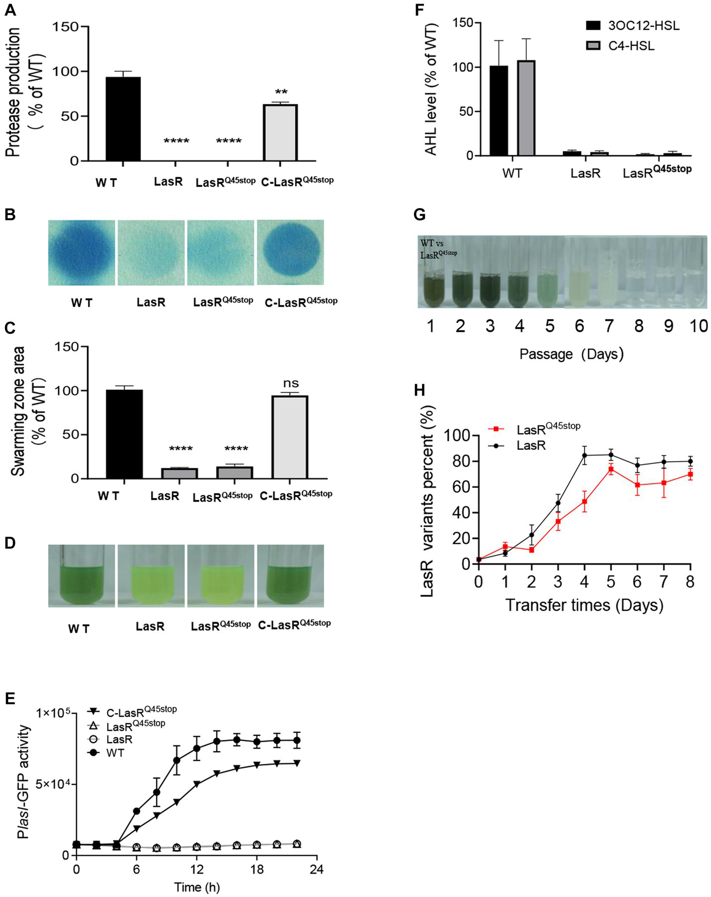 Figure 1. Characteristics in QS regulon of LasRQ45stop in solitary presence and co-culture states. (A) Protease production on casein agar. The PAO1 LasR mutant and the LasRQ45stop mutant produce relatively little protease. All data shown are the average values of three independent experiments ± SD. (B) Cyanide production by P. aeruginosa strains and mutants. Cyanide was monitored as described in Materials and methods. The blue coloration of the filter paper reflects cyanide production. (C) Swarming motility phenotype of PAO1 wild-type and LasR mutants. All data shown are the average values of three independent experiments ± SD. (D) Color changes of P. aeruginosa cultures in the presence of LasR mutant after 24 h, a reflection of the effect of LasR mutant on phenazine production. (E) LasR activity in the LasR mutant and PAO1 measured as GFP fluorescence (RFU). All strains contained the PlasI-gfp fusion plasmid pProbe-GT-PlasIgfp. (F) Relative AHL levels of the indicated strain. The AHL levels produced by strain PAO1 are defined as 100%. AHL was measured after 18 h of growth in LB-Mops broth. All data shown are the average values of three independent experiments ± SD. (G) An example of one serial transfer experiment. Each photographic image was captured after 1 day of growth. The relative abundance of LasR mutant (as a percentage of the total population) in culture samples just before transfer (60 μL) is distinguished by resistance markers, and the daily passage number is shown below the tubes. Cultures that only partially degrade casein have a milky white appearance due to protein precipitation. (H) Competition between WT PAO1 and LasR mutant (black), or LasRQ45stop mutant (red). The initial frequency of LasR mutant was 0.01. Three biological replicates were performed. All data shown are the average values of three independent experiments ± SD. Two-tailed p-values were determined using unpaired t-tests. Statistical significance: *p < 0.05, **p < 0.01, ***p < 0.001, and ****p < 0.0001; ns, no significant difference (p ≥ 0.05).