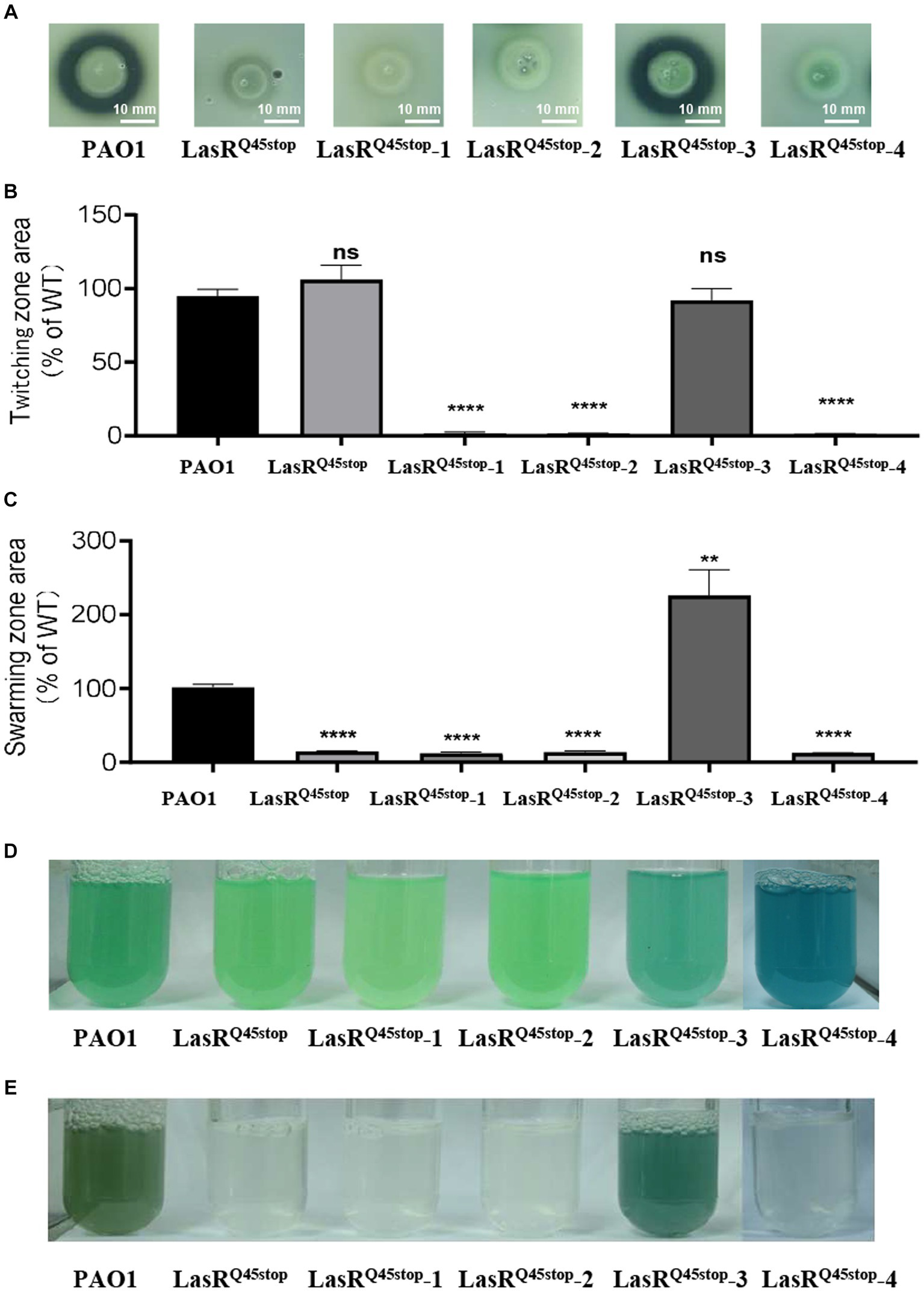 Figure 2. Characteristics of three protease-negative LasRQ45stop mutant variants (LasRQ45stop-1, LasRQ45stop-2, and LasRQ45stop-4) and protease-producing LasRQ45stop (LasRQ45stop-3) mutant variants derived from the LasRQ45stop mutant. (A) Protease production of isolates from co-cultured casein broth was measured on plates containing 1% (m/v) skimmed milk for 24 h. (B,C) Motility phenotypes of P. aeruginosa PAO1 and its isogenic QS LasRQ45stop strains. Image showing the comparative zone of twitching (B) and swarming motility (C) of PAO1 and its isogenic QS LasRQ45stop strains. All data shown are the average values of three independent experiments ± SD. (D,E) Cultures of P. aeruginosa PAO1, a LasRQ45stop mutant, and the evolved LasRQ45stop variants, grown in LP medium for 24 h (D) and casein broth for 48 h (E). The culture is visibly blue as a result of pyocyanin overproduction. Three biological replicates were performed. All data shown are the average values of three independent experiments ± SD. Two-tailed p-values were determined using unpaired t-tests. Statistical significance: *p < 0.05, **p < 0.01, ***p < 0.001, and ****p < 0.0001; ns, no significant difference (p ≥ 0.05). Scale bar = 10 mm.