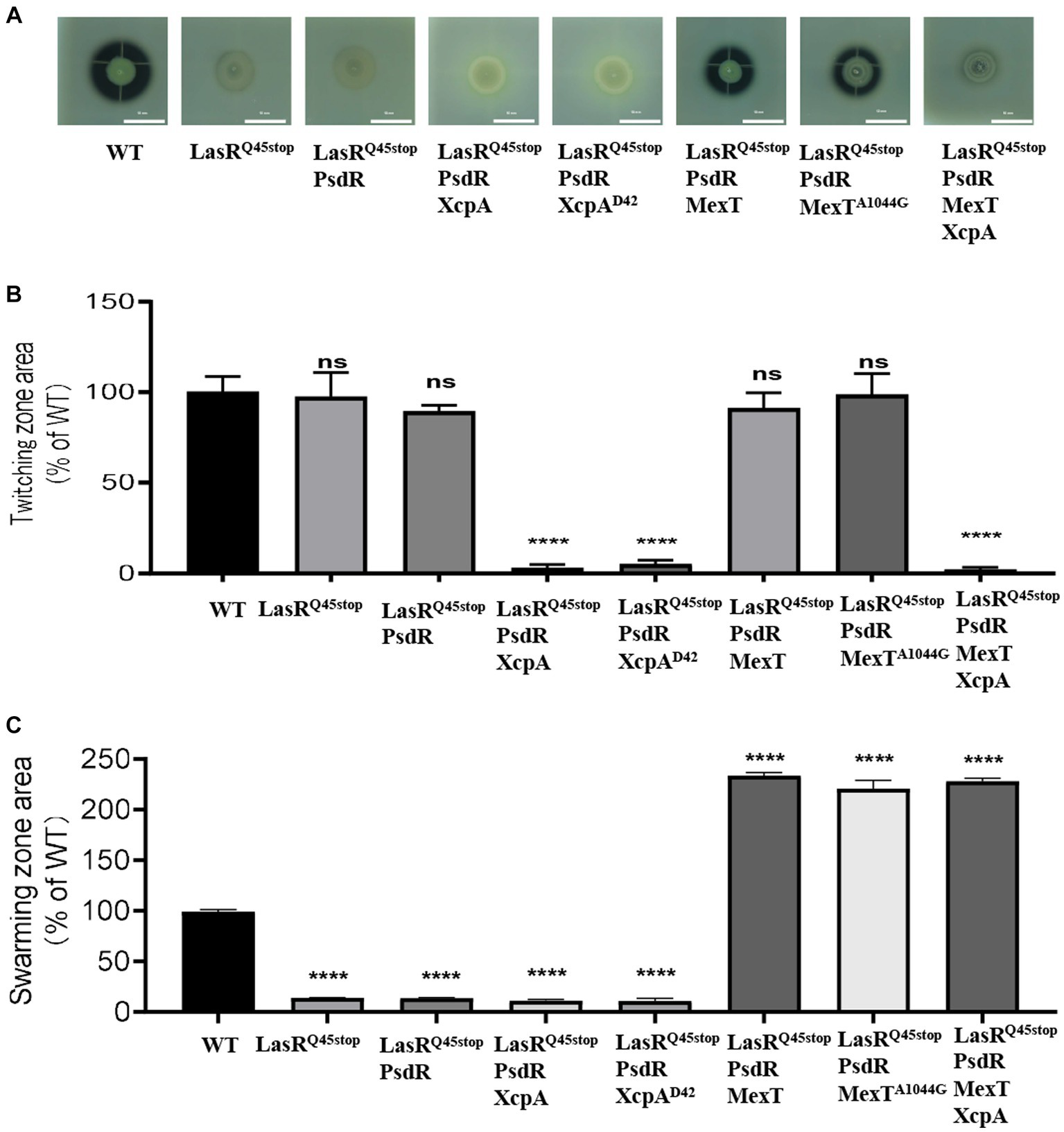Figure 3. mexT and xcpA was related to the phenotype changes. (A) The influence of PsdR, MexT, and XcpA mutations on protease production in the P. aeruginosa LasRQ45stop mutant. The images are of colonies after about 24 h of incubation in milk agar plate. The influence of PsdR, MexT, and XcpA mutations on twitching (B) and swarming (C) motility phenotypes in the P. aeruginosa LasRQ45stop mutant. Three biological replicates were performed. All data shown are the average values of three independent experiments ± SD. Two-tailed p-values were determined using unpaired t-tests. Statistical significance: *p < 0.05, **p < 0.01, ***p < 0.001, and ****p < 0.0001; ns, no significant difference (p ≥ 0.05). Scale bar = 10 mm.