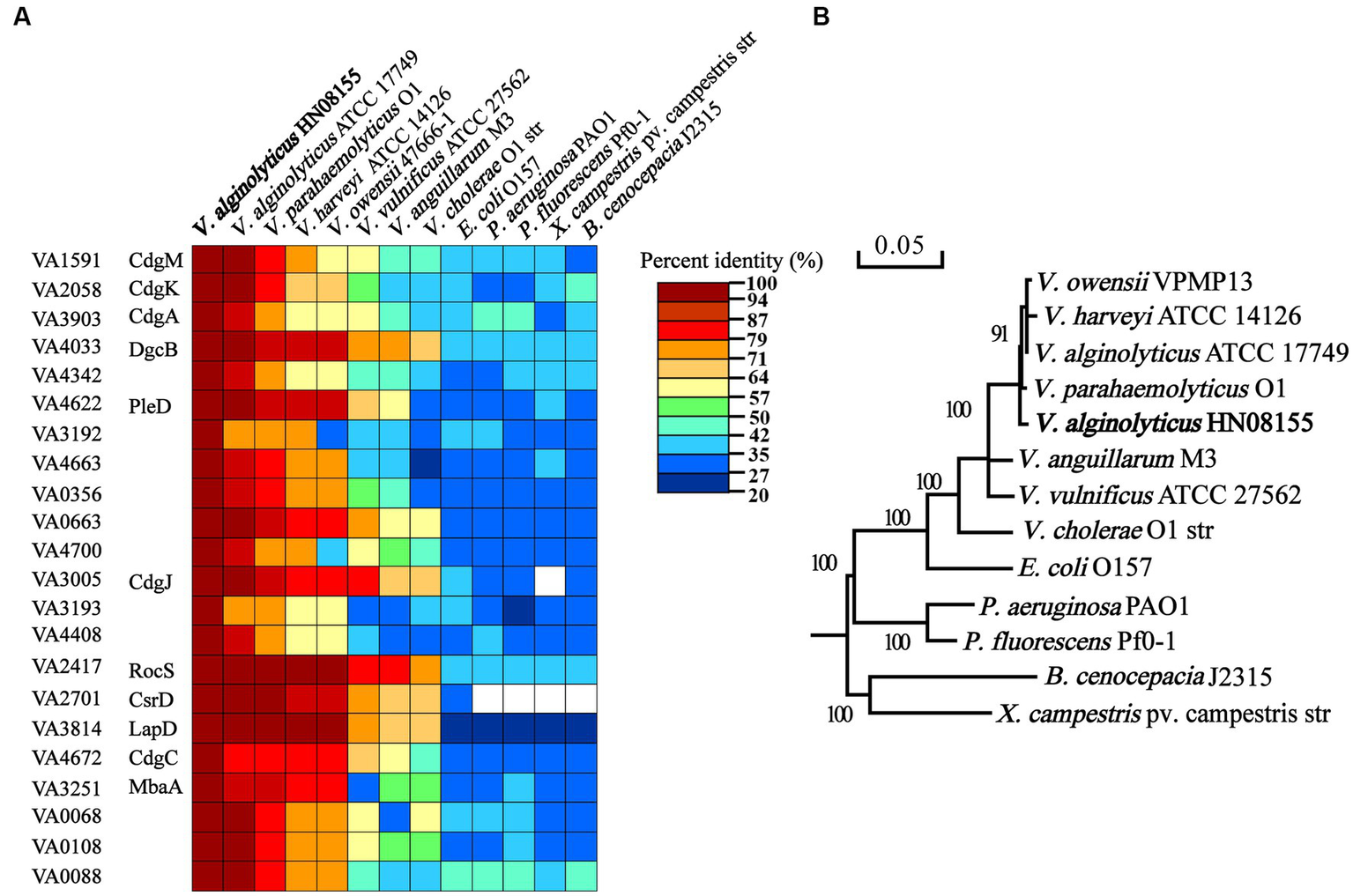 Comparisons of the 22 c-di-GMP metabolic proteins of Vibrio alginolyticus containing a GGDEF or EAL domain with those of closely related Vibrio species and other bacterial species (A). Phylogenetic tree analysis of V. alginolyticus and other species based on 16S rRNA gene sequences (B).