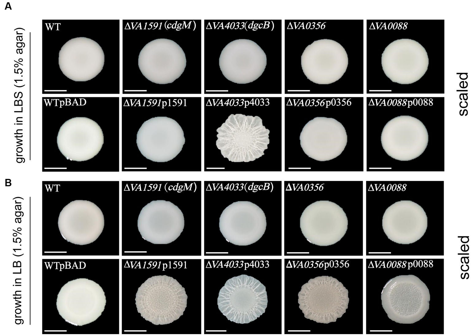 Different stages of biofilm formation, including surface attachment, matrix production, biofilm maturation and dispersal, are regulated by sophisticated regulatory networks (Yildiz et al., 2001; Wang et al., 2014; Townsley and Yildiz, 2015). Evidence is mounting that the near-ubiquitous second messenger cyclic diguanylate (c-di-GMP) plays a central role in different stages of biofilm formation in a diverse group of microorganisms (Purcell et al., 2012; Romling et al., 2013; Valentini and Filloux, 2019; Ahmad et al., 2020). In the case of Vibrio spp., the best-studied example is Vibrio cholerae, the causative agent of the human disease cholera. It is now generally accepted that high levels of c-di-GMP promote extracellular polysaccharide (EPS) production and enhance biofilm formation of V. cholerae, while low levels of c-di-GMP increase cell motility and cause biofilm dispersal (Liu et al., 2010; Conner et al., 2017; Biswas et al., 2020; Wu et al., 2020). Recent evidence obtained from one of the dominant marine Vibrio spp., Vibrio parahaemolyticus, has also made it clear that high c-di-GMP favors biofilm formation (Kimbrough et al., 2020; Martinez-Mendez et al., 2021). In addition, interfering with c-di-GMP metabolism and signaling has been shown to be a promising way to control biofilm development (Liu et al., 2022; Kim et al., 2023). Therefore, modulation of the intracellular c-di-GMP pool is a key regulator of bacterial adaptation to sessile and motile lifestyles in response to complex environmental and internal cues.