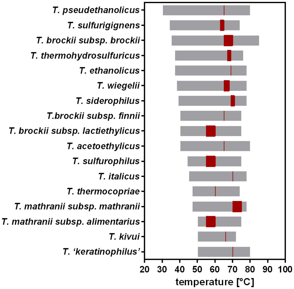 Previously reported temperature ranges and optimal growth temperatures for different Thermoanaerobacter species. Temperature range, gray; TOPT, red. Data from Onyenwoke and Wiegel (2015).