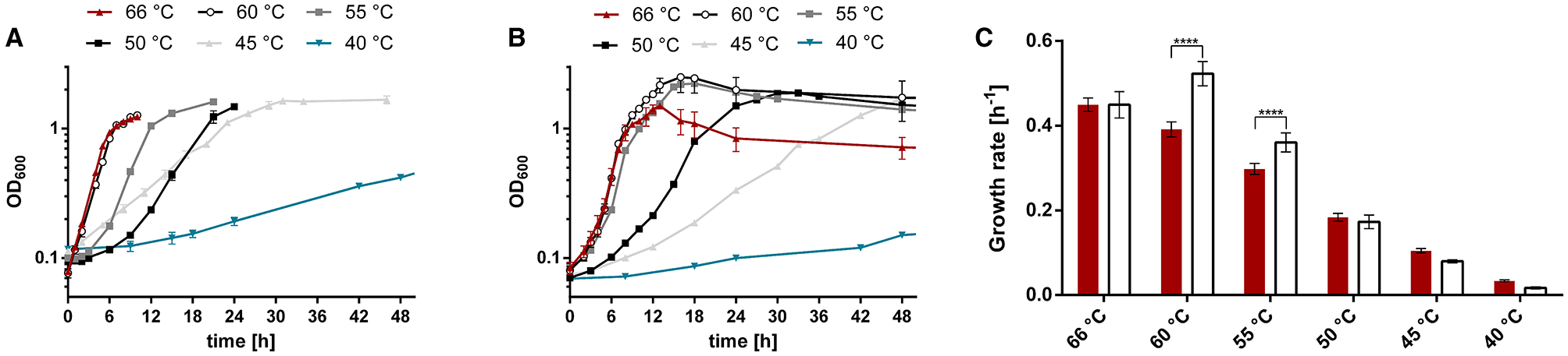 Growth of T. kivui strains (A) DSM2030 (type strain) and (B) Adpt45_67 at different temperatures, and (C) the corresponding growth rates. Cells were grown in 50 ml complex medium in 100 ml serum bottles with 25 mM glucose as a carbon source. Red triangles, 66°C; black open circles, 66°C; gray squares, 55°C; black squares, 50°C; gray triangles, 45°C; turquoise inverted triangles, 40°C. The error indicated shows the standard deviation from four biological replicates. Significant statistical differences (***p < 0.0005, two-way ANOVA with Tukey's test) between the type strain and the adapted strains at each temperature condition are shown.