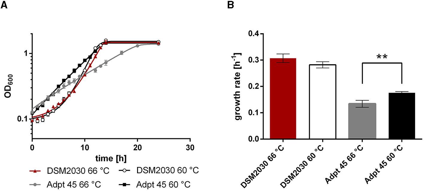 Growth of T. kivui strains (A) DSM2030 (type strain) and Adpt45_67 in the defined medium at 66°C and 60°C, and (B) the corresponding growth rates. Red, type strain at 66°C; white, Type strain at 60°C; gray, Adpt45_67 at 66°C; black, Adpt45_67 at 60°C. Cells were grown in 50 ml of medium in 100 ml serum bottles with 25 mM glucose as a carbon source. The error indicated shows the standard deviation from four biological replicates. Significant statistical differences (**p < 0.005, two-way ANOVA with Tukey's test) between the type strain and the adapted strains at each temperature condition are shown.