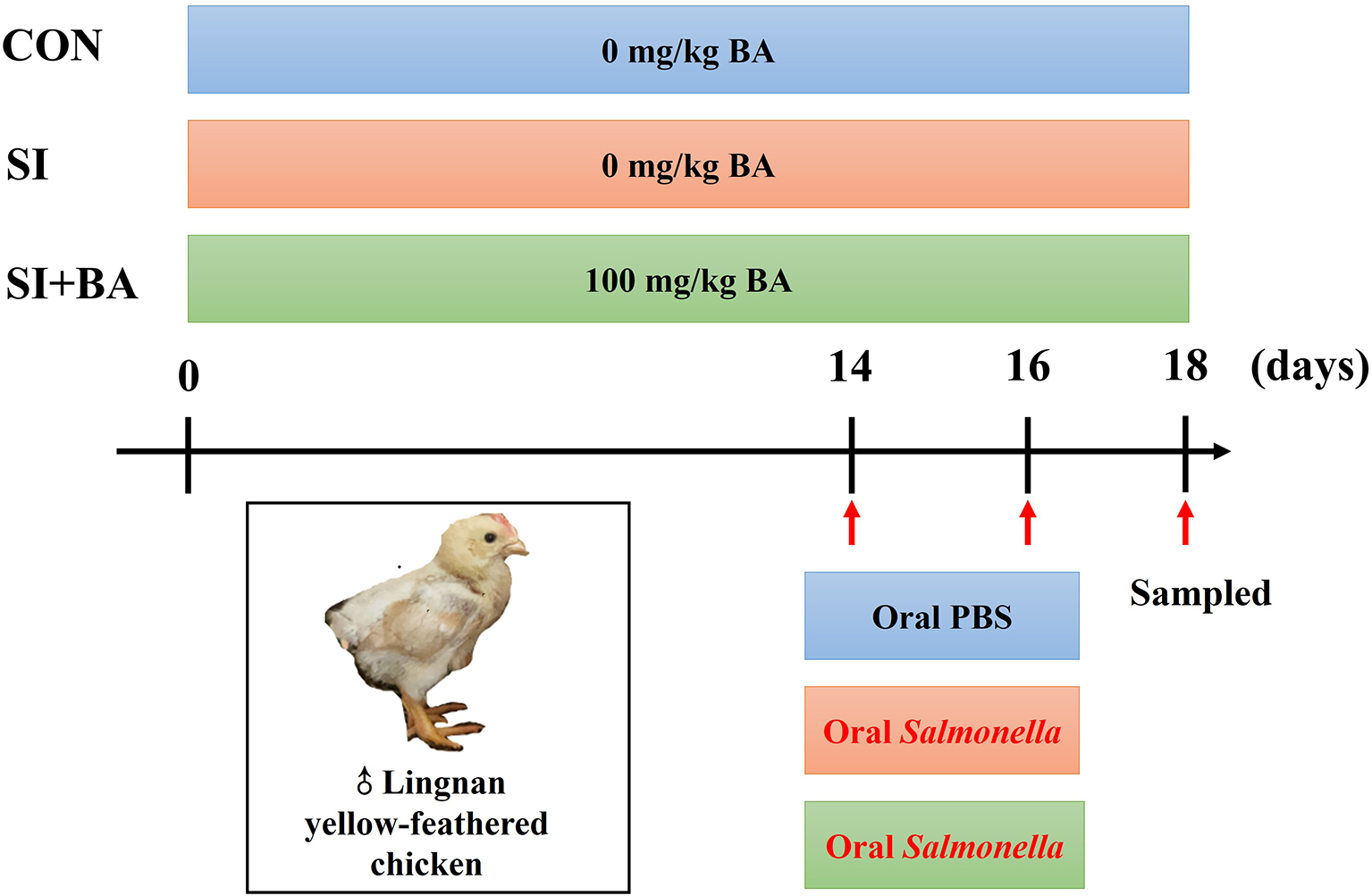 A total of 180 newly hatched yellow-feathered male chicks were assigned to three groups (CON, SI, and SI + BA). Birds in CON and SI were fed a basal diet, and those in SI + BA were supplemented with 100 mg/kg BA for 18 days. Birds in SI and SI + BA received 0.5 ml suspension of S. Typhimurium (2 × 109 CFU/ml) by oral gavage at 14 and 16 days of age, and those in CON received equal volumes of sterile PBS.