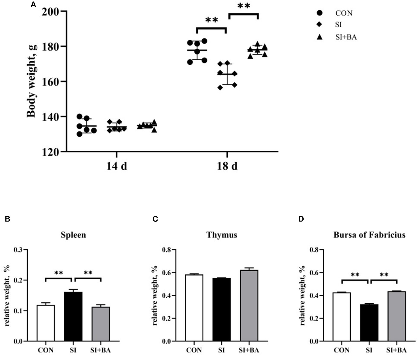 Effect of supplementation with bilberry anthocyanin on the body weight and relative weight of immune organs in chickens challenged with S. Typhimurium. (A) Body weight. The relative weight of (B) spleen, (C) thymus, and (D) bursa of Fabricius. CON, control group; SI, S. Typhimurium infection group; SI + BA, S. Typhimurium infection and dietary BA supplementation group. The data are means ± SEM, n = 6 (**P < 0.01).