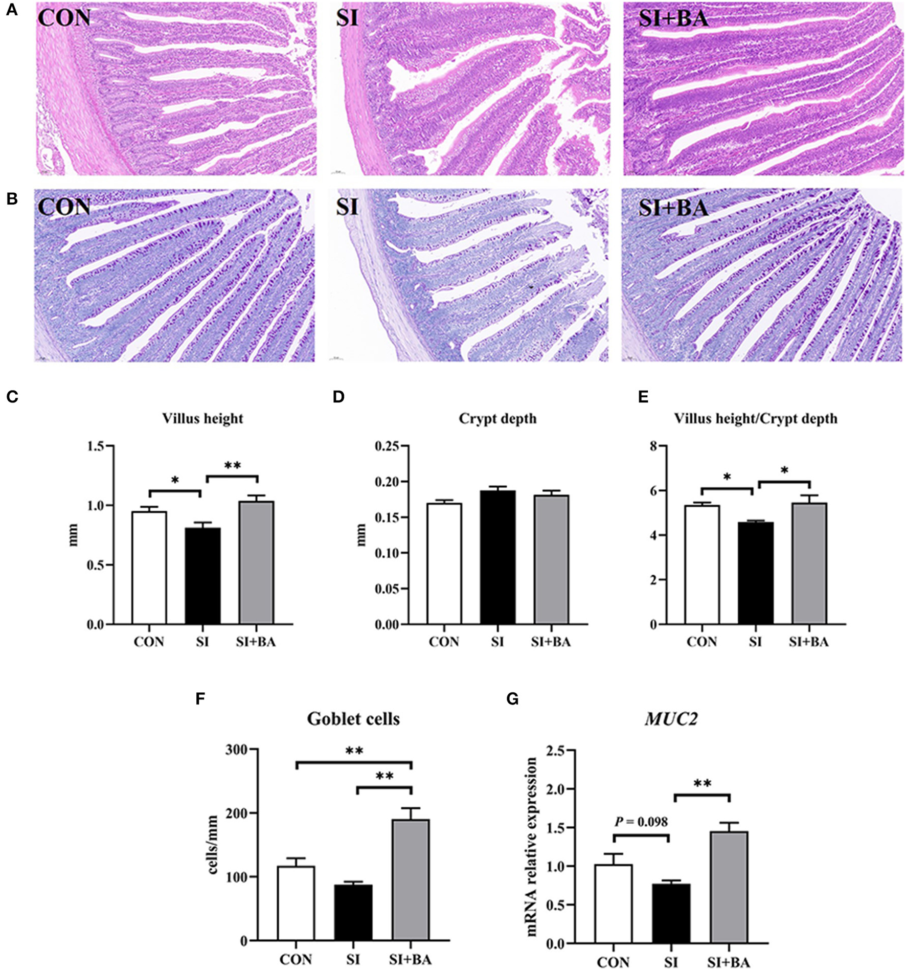Effect of bilberry anthocyanin on jejunal morphology of chickens challenged with S. Typhimurium. Representative images of (A) H&E-stained and (B) PAS-stained jejunal sections (scale bar at 100 μm). (C) Villus height, (D) crypt depth, and (E) villus height/crypt depth in the jejunum of chickens. (F) The number of goblet cells and (G) the mRNA expression of MUC2 in the jejunum of chickens. CON, control group; SI, S. Typhimurium infection group; SI + BA, S. Typhimurium infection and dietary BA supplementation group; MUC2, mucin 2. The data are means ± SEM, n = 6 (*P < 0.05, **P < 0.01).