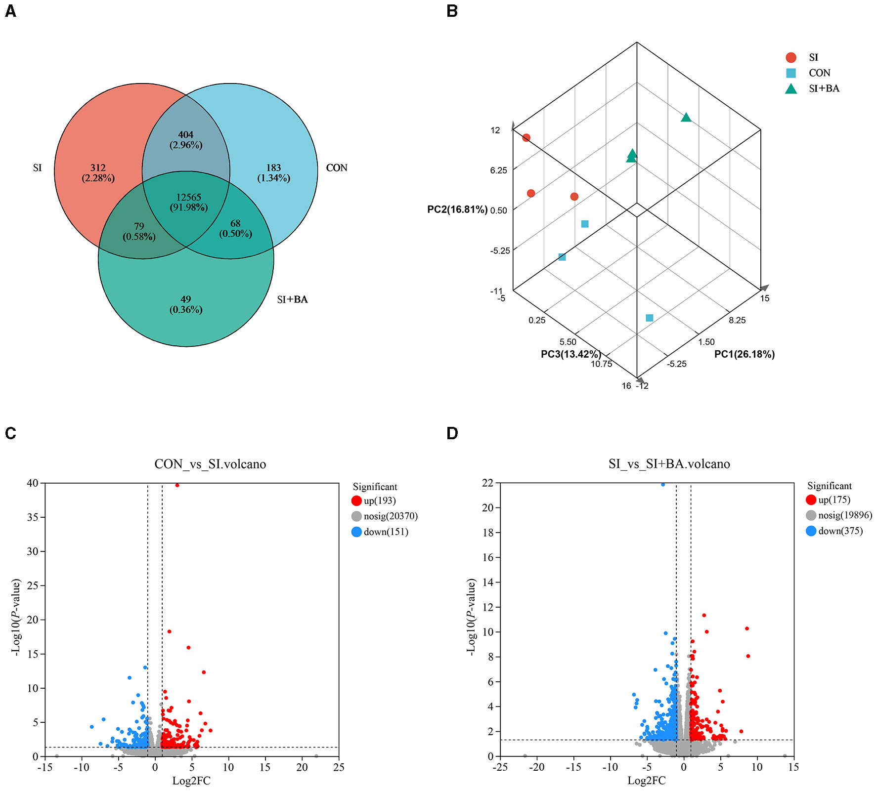 Effect of bilberry anthocyanin on the jejunal global gene expression pattern of chicken challenged with S. Typhimurium. (A) Venn diagram of the number of genes expressed. (B) Principal component analysis (PCA) of each sample on the whole genome. Volcano map of differentially expressed genes about (C) CON vs. SI and (D) SI vs. SI + BA. CON, controls; SI, chickens infected with S. Typhimurium; SI + BA, chickens supplemented with dietary BA and infected with S. Typhimurium; PC, principal component; FC, fold change; nosig, no significant change.