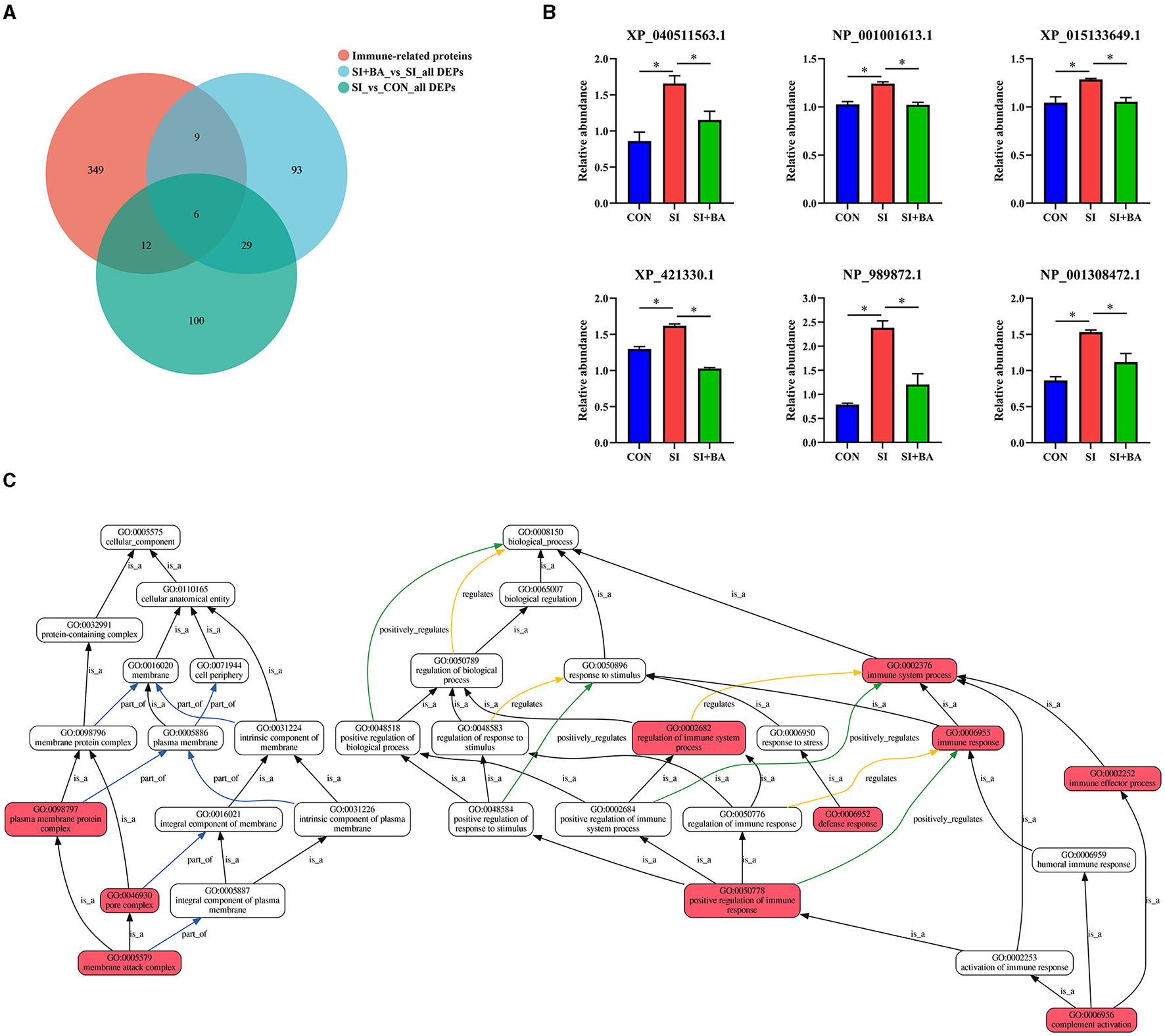 Effect of bilberry anthocyanin on the immune-related proteins in the jejunum of chickens challenged with S. Typhimurium. In all parts, CON indicates controls; SI are chickens infected with S. Typhimurium; SI + BA are chickens supplemented with BA and infected with S. Typhimurium; data in B are means ± SEM, n = 3 (*P < 0.05). (A) Venn diagram of the number of immune-related proteins expressed and those that are differentially expressed. (B) Differential expression of immune-related proteins. (C) Gene Ontology (GO) enrichment analysis of immune-related DEG. Each box represents a GO term (level 2), and the line indicates the relationship between the two GO terms; the closer it is to red, the more significant it is.